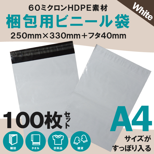 通信販売、フリマアプリのメール便発送や宅配便配送の梱包資材に欠かせないビニール袋です。 HDPE素材は密度が高く、他のポリエチレンよりも硬い素材になりますので、雨や水濡れにも強く厚手の素材で破れにくくなっています。 透明度も低いので中身が見えづらくなっているのも特徴です。 フタ部分に付いている両面テープはとても強力な粘着を使用しているので、 一度くっつけると離れません。簡単に梱包ができます。 また衝撃などにも非常に強く、手で引き伸ばしてもなかなか破れません。 荷物を安心して運べるので、天候や移動中のトラブルが起こる不安を解消できます。 ――――― おすすめポイント ――――― ・高品質で安価な価格設定 ・水や空気を通さない ・ほかのビニール素材と比べると臭気が低い ・着色されているのでプライバシーが守られる ・衝撃や引っ張りにとても強い ・熱や冷気に強い ――――― その他のサイズはこちら ――――― 【A4すっぽりサイズ】250mm×330mm+フタ40mm 100枚 【A4すっぽりサイズ】250mm×330mm+フタ40mm 500枚 【A4大き目すっぽりサイズ】280mm×380mm+40mm 100枚 【A4大き目すっぽりサイズ】280mm×380mm+40mm 500枚 【B5すっぽりサイズ】200mm×260mm+フタ40mm 100枚 【B5すっぽりサイズ】200mm×260mm+フタ40mm 500枚