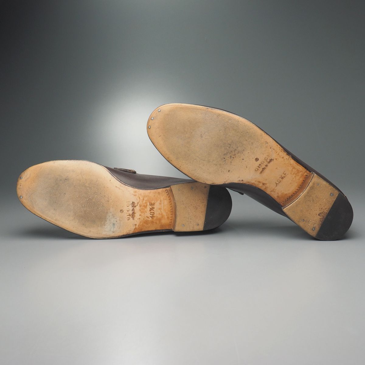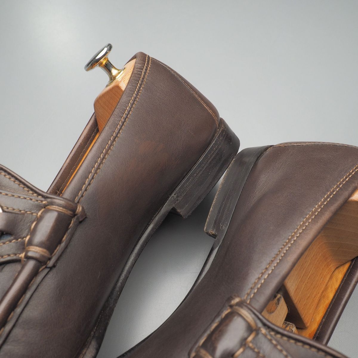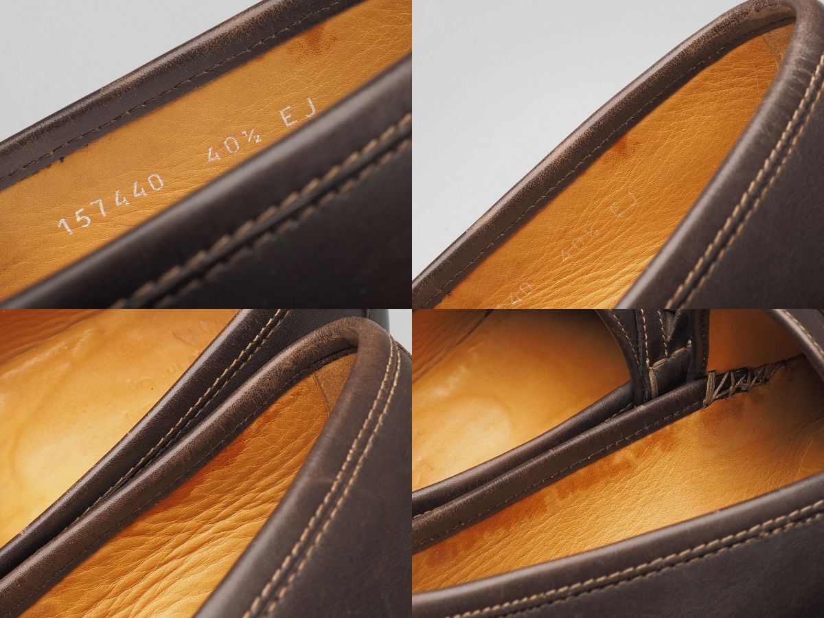 【コンディション詳細】 アッパーのシワ、薄い擦れや色ムラ、またインソールやライニングの擦れや薄汚れ、シミが見られますが、その他気になるようなダメージ等なくこれからも気持ちよくご愛用いただけます。 アウトソールの減りはトゥで2mm程度、ヒールで4mm程度、右足のトゥに1か所釘抜けがございます。 |