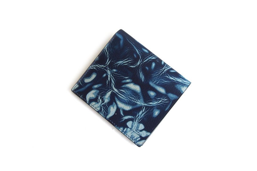 「スクモレザー」とは、国選定無形文化財である徳島県の阿波藍を用い、京都で天然灰汁建本藍染された世界でも稀有な天然本藍染革。