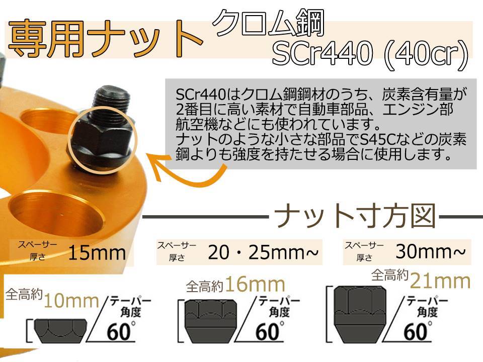 | RPGオリジナルの高強度な鍛造ワイドトレッド スペーサーです。 アルミホイールとボディのツラ合わせに必需品です。 CNC旋盤、フライス盤加工による高精度な作りとなってます。 今回ハブボルトの材質にもこだわりましてクロモリ鋼(SCM435)に変更いたしました。 クロモリ鋼は他にもクランクシャフト、フライホイール、スタビライザー、ボルト、継手、航空機脚部品、エンジン部品などにも使われておりSCM435はクロモリ鋼の中でも引っ張り強さ930N/mm2以上で比較的高めの機械的性質を持ちます。 純正品以上の強度で安心してご使用できます。 製品仕様 本体 :PCD100 外径/146mm、内径/64mm、厚み/70mm 穴 :4穴 ネジピッチ :M12×1.25(ニッサン・スバル・スズキなど) 素材 :鍛造アルミA6061-T6 アルマイト仕上 ハブボルト :クロモリ鋼(SCM435) ハブボルト高さ(スペーサー端面より) スペーサー15mm約35mm / スペーサー20mm以上約30mm 使用上の注意 装着前には必ずワイヤーブラシ等でハブボルトのスレッジや汚れ、錆を取り除いてください。 電動やエアーを含むインパクト工具での締め付けは絶対に行わないでください。 一瞬でも高トルクがかかりますとワイトレのスタッドボルトのカシメ部破損、アルミナットのワレ破損が起こる場合がございます。 ご面倒でも必ず手工具+トルクレンチによる規定トルクにて締め付けをお願いいたします。 アルミホイール専用ですのでスチールホイールには使用できません。 スチールホイールですとスペーサーとの接地面が狭く、危険でございます。 ドラムブレーキ車は取付可能ですが使用しないでください。 純正スタッドボルトがスペーサーの厚みより長い場合はホイールの裏側に逃げがあるか確認してください。 スライドドアの車両に取り付ける場合は、ドアとタイヤが干渉することがあるためタイヤのはみ出しすぎにご注意ください。 装着後は約100㎞を目安に適正トルクで増し締めしてください。 又、装着後はゆるみ等がないか定期的に点検してください。 こちらの商品は競技用部品です。 実際の商品は生産時期等により画像と色合いが異なることが御座います。 海外製輸入品のため少しのキズや打痕、アルマイトの乱れや汚れなどあることがございますがご了承願います。 一度取り付け,使用された商品は返品できません。 購入前に必ず専門知識のある方にサイズ等の確認をお願いいたします。 ★お買い物の際は必ず下記ご利用規約をお読みください。ご入札・ご購入された時点で同意頂けたものとします。 | |