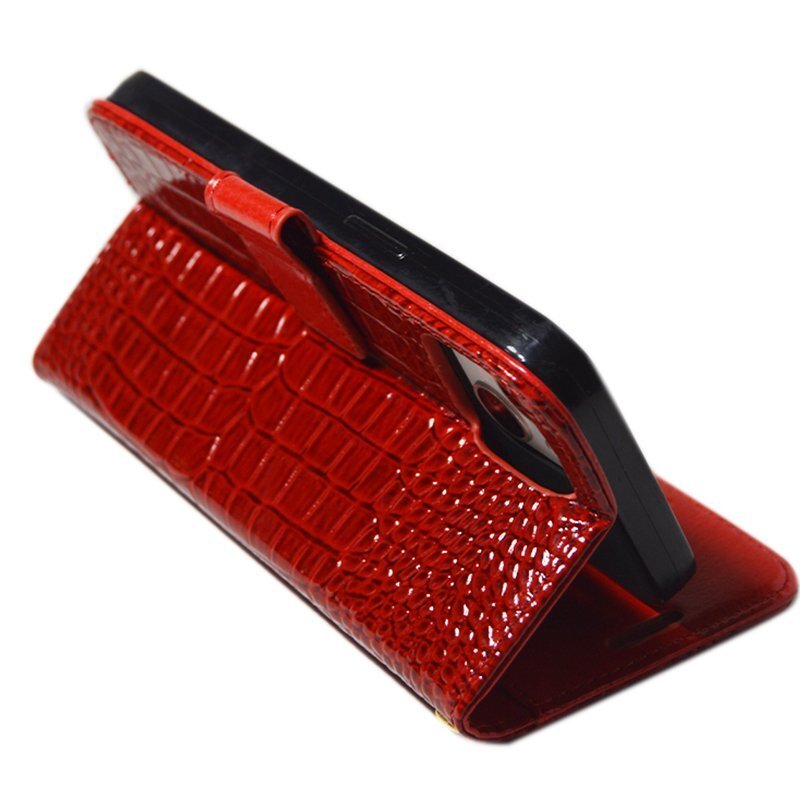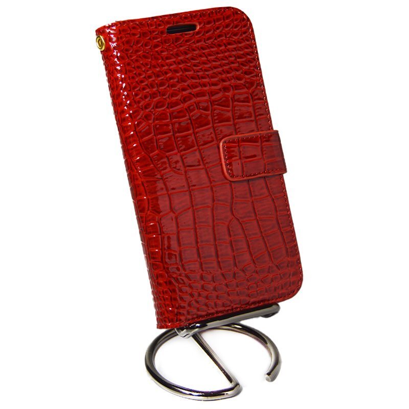 ■ 形状:手帳型 (マグネット付着) / 折り畳みスタンド / 内側カード収納ポケット / ハトメストラップホール加工あり | 付属品:クロコダイル柄ストラップ