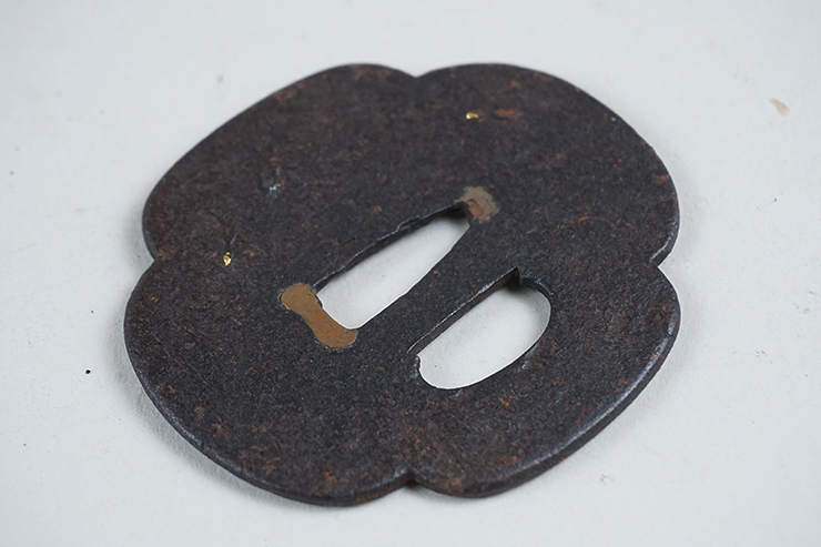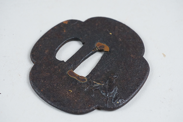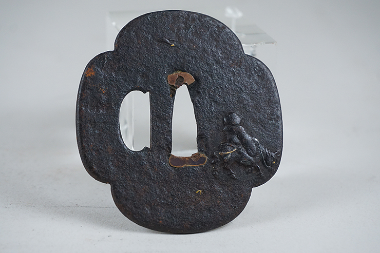 | 小ぶり、脇差し用、鉄鐔です。 時代はあるかと思います。人物図、象嵌も残ります。 画像ご参考の上ご入札ください。 巾69.9×64.6mm 茎孔23.0×8.3mm 重さ61g | ||