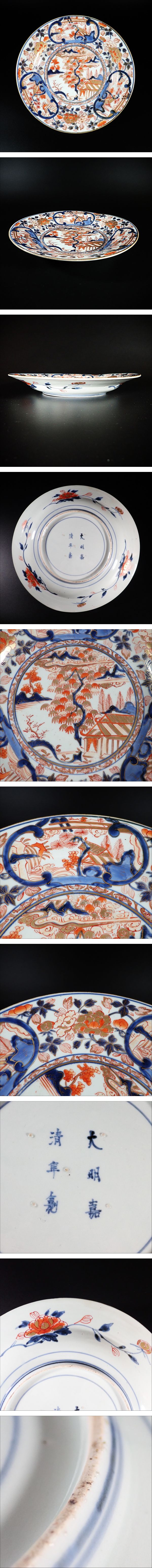 ■ 商品説明 元禄期らしい華やかな発色で、楼閣や山水が丁寧に描かれた大皿です。 見込みの紅葉と楼閣の景色も細かく描写され、周囲には花文や風景がバランスよく配置されています。 赤・藍・金の色合いもきれいに残っており、飾っても存在感のある一枚です。 裏側には 「大明嘉清年製」 の銘が入っています。 |