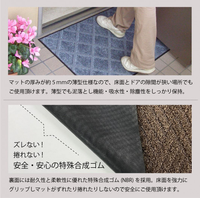 | タワシ状のブラッシング繊維が靴底の汚れをしっかり掻き落とす、泥落とし用玄関マット。落とした汚れは高密度なパイルの中に取り込むので、周囲を綺麗に保ちます。ドアの開閉の邪魔にならない厚さ5mmの極薄仕様。つまづき防止にもなります。マット裏面に柔軟性の高いラバーを採用、ズレやたくれが発生しにくい設計です。 ・商品は表面の毛足が寝ている状態でお届けいたしますが、洗濯することで起毛いたします。 ・洗濯以外に、ブラシ等で毛足と逆方向にブラッシングすることでも毛起こしできます。 ※モニターの種類やパソコンの環境により、実際の商品のお色と若干異なる場合がございます。 |
