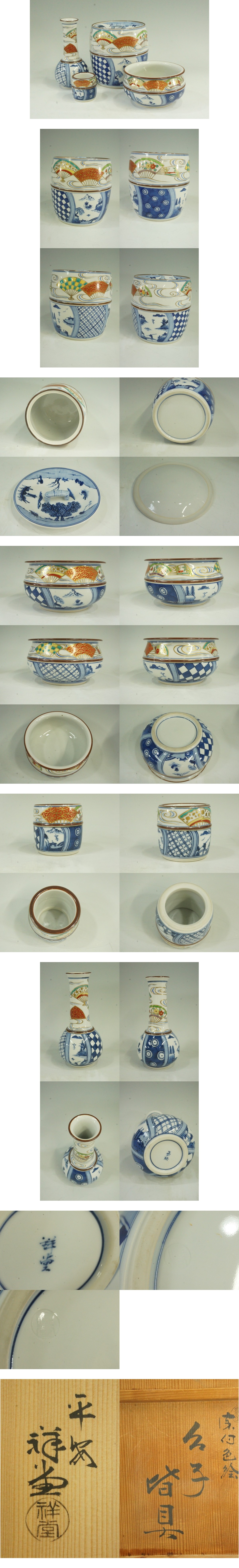 祥瑞の染付を下部に、上部には扇面・流水文の色絵が施された磁器の皆具4点セットです。