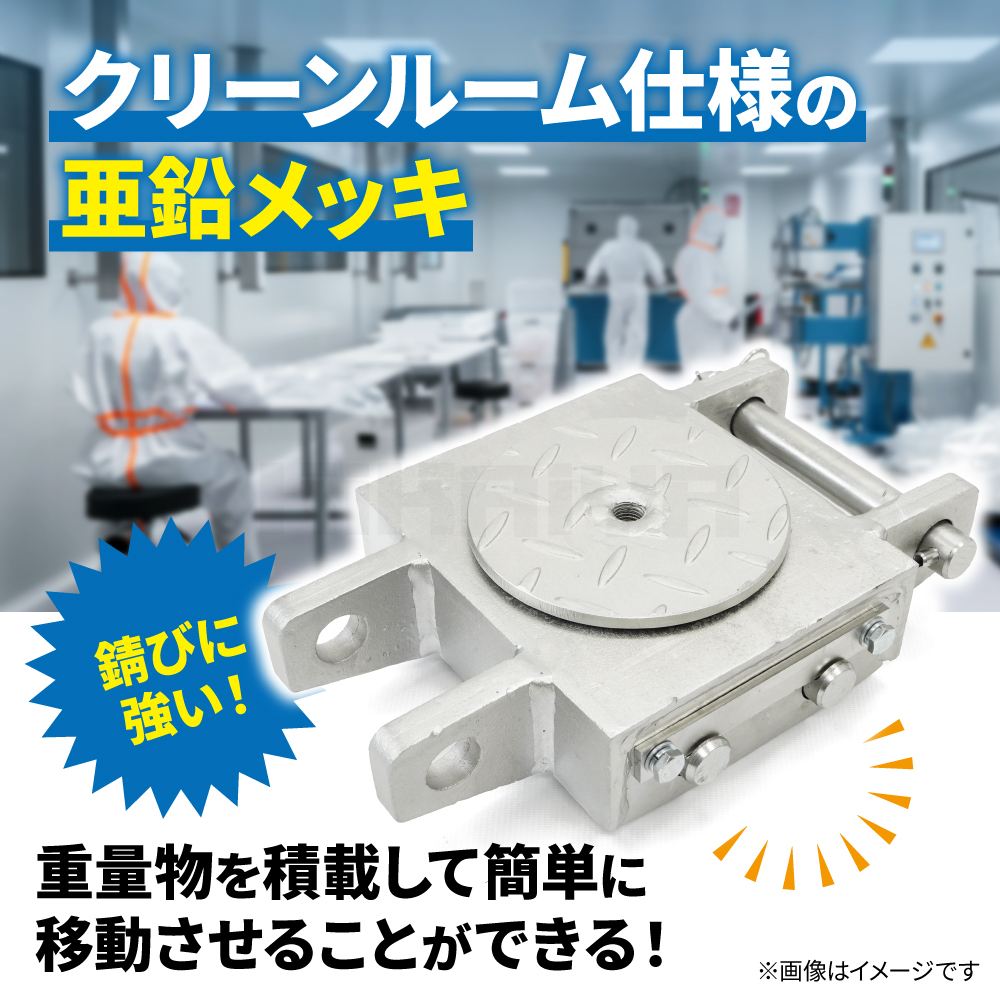 錆びに強い亜鉛メッキでクリーンルーム仕様! ●重量物を積載して簡単に移動させることができる設置用ローラーです ●ターンテーブルは360度スムーズに回転します(固定はできません) ●車輪はナイロンローラー採用で湿った床などでも使用できます 全てステンレス(SUS430)ベアリング入りで錆びつかずスムーズに転がります ●本品(同サイズ)を前後・左右に複数台組み合わせて使用する事も出来ます ※製品改良の為、予告なく仕様を変更する場合がございます ご使用に問題のない場合(返品/交換)はお受けしておりませんのでご了承ください |