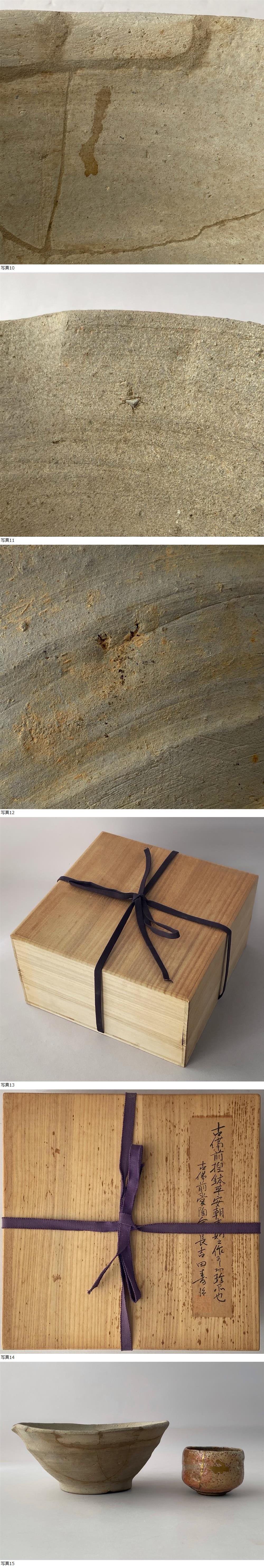 この度は数あるオークションからご覧いただき、ありがとうございます。 希少珍品 平安時代 「古備前捏鉢」横幅31㎝ 古備前愛陶会長 墨書 印付き二重箱 です。 ■商品説明■ 備前焼の興りは平安時代、窯が築かれた当初は、須恵器の影響が色濃く残っており、白や灰色のやきものが多く焼かれていたようです。 本出品作も、須恵器の影響を色濃く残す灰色の片口捏鉢となります。 また古備前研究の第一人者として知られる、桂又三郎が所属し、同氏の著書の出版をしていた古備前愛陶会の会長の墨書、印の入る二重箱に収められ大切にされてきたであろうお品物です。 珍品也との記載もあり、とても珍しい物かと思われます。 骨董・古陶磁の魅力を感じて頂ける方、是非この機会にご検討ください。 ■サイズ(約)■ 横幅31㎝(口~縁) 高さ14㎝ ■商品状態■ こちらは古い物となり、商品状態・時代感を損なわぬ様、乾拭きなどの簡易清掃にて出品しております。 継ぎ直し等の補修がございます。 ほか時代・保管・使用に伴うスレ、傷、汚れ等ございますが、古い物となります為、ご理解・ご承知おきください。 詳細な状態につきましては画像にてご判断頂きご入札をお願い致します。 ※敷板・茶碗など、撮影用・サイズ比較用となります為、付属致しませんのでご理解の上ご入札ください。 ※下記、発送詳細・支払い方法・その他、注意事項をご一読ください。 |