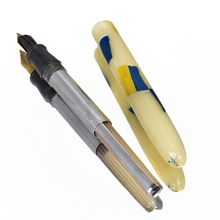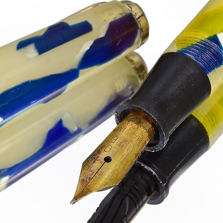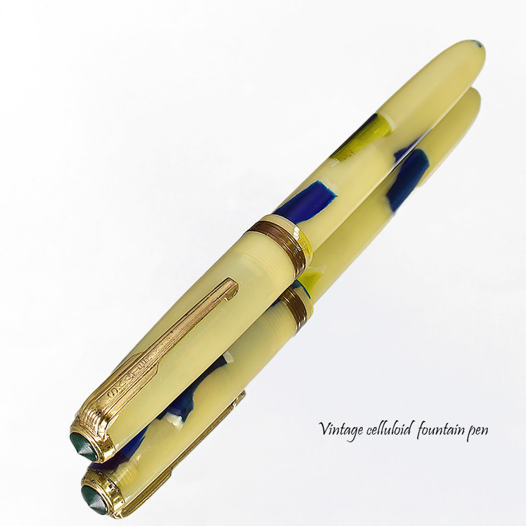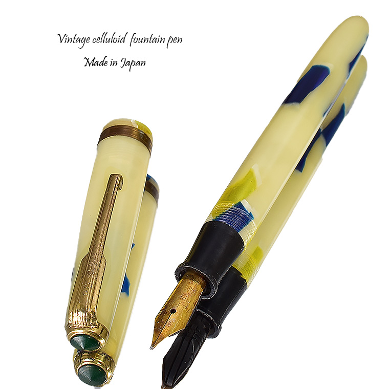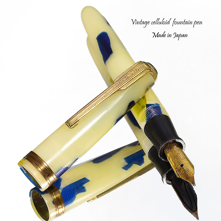 | ビンテージ セルロイド万年筆 中押し式 ペン先 EF(極細)程度 レストア済み 希少な逸品 Made in JAPAN 日本製 ![]() こちらは、1950年代から1960年代にかけて製造された貴重なビンテージセルロイド万年筆。 終戦を迎えた70年程前、かつて日本の下町などでたくさんのセルロイド工場や加工場があった時代、 そういった工房で凄腕の職人さんが、ハンドメイドで仕上げた万年筆、 今回ご紹介するのは、そんな過去の貴重な万年筆をレストアしたものです。 職人さんの工房で保管されていた数少ないセルロイド万年筆を、彼の手によって 少しずつレストアしていただきながら、そしてその手法を教えていただきながら 出来上がったもの、譲ってもらったものです。 約半世紀の間、大事に保管されていたとしても、メンテナンスは必要なコンディションでした。 その為、その職人の指導の下、ひとつひとつ古い部品を取り換え、ニブの調整をするなど、 共同でメンテンナンスを行いました。 ![]() <レストアを行うにあたり…> ペン先選び、ペン芯とペン先がマッチしないと書けません。 (昔の万年筆は、パーツが手作りなので、一つ一つ適したものを合わせていきます。) 当時のペン先は、適合させて温度をかけて、緩めたり固定したりする必要があります。 筆記ができる状態にするまで多くの手がかかりますが、当時の職人さんが作ったペン先、 そのしなりや書き心地。それは現在の市販の万年筆では味わうことができないかと思います。 日本人が日本人の技術で日本の漢字を書くために研ぎだしたペン先。 そのペン先の本当の魅力を引き出すのが職人の技です。 ![]() 今回出品のペン先はEF(極細)程度です。 日本製ニブのペン先をお楽しみください。 ![]() インクの吸入方式は【中押し式】です。 【コンバーターが固定】されてますので、使いやすくお好きなインクを吸入して お楽しみいただければと思います。 ![]() <セルロイドの魅力> 素材はセルロイド、 角度によって、次々と色味をかえるセルロイドは、まるで光が瞬いているようにも見えます。 また、滑らかな肌触りのセルロイドは、しっとりとした質感と 程よい重さをもっているので、本当に心地よいホールディングを堪能いただけます。 ボディサイズは、手の平に収まるサイズで、こじんまりとして見えますが、 当時日本から海外に輸出されていた万年筆の一般的サイズであり、 文豪たちが使う太軸万年筆ではありませんが、本当の実用サイズだと考えられます。 大きな万年筆に見慣れた今見ると、とてもかわいい万年筆に見えます。 ![]() ビンテージ万年筆の魅力は、時代を反映した独特なデザイン、現在では入手困難な素材。 そして、時間の経過とともに増すビンテージの風合いではないでしょうか。 使い込む程手に馴染み、愛着が湧いてくる楽しさは、ビンテージ万年筆でしか味わう ことができません。 貴重なビンテージ万年筆との出会いも一期一会です。 是非ご覧ください。 ************************************************************************* ≪万年筆詳細≫ ニブ : スチール ※日本製 サイズ : EF(極細)程度 機構 : 中押し式コンバーター固定 材質 : セルロイド 長さ : 約125mm 太さ : 約10.5mm(軸)/12.3mm(キャップ) 重さ : 約12g 付属品 :簡易発送用紙ケース ※こちらの商品は金属部などに経年変化が見られます。 筆記には問題はございませんが、稀少なビンテージ品,アンティーク品の特性として ご理解の上、ご購入ください。 実物写真を掲載していますので、写真をご確認の上、ご了承の上、入札ください。 今回出品分は天冠部分にリングの割れ(接着済)と僅かなズレがあります。 ※モニターの環境により、画像と実物の色合いが若干異なる場合がございます。 予めご理解・ご了承の上、ご購入お願い致します。 ************************************************************************ |