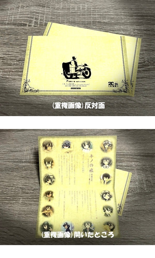 | ------------------------------------------------------------------------ ж ж ж 商品について ж ж ж ------------------------------------------------------------------------ ◆ 「 キノの旅 / 二つ折りの印刷物 」 × 同じもの2枚 当時の書店配布品です。 画像の二つ折り状態で ポストカード程度の大きさです。 入手よりかなり経年しており、 初期、経年 による劣化、及び 保管時、取り扱い時などのダメージ必至です。 ※ 商品は 画像1枚目のもので全てです。書籍やメディアなどは含まれません。 ※ 自身が 当時 新品で入手した ワンオーナー品です。 ※ 画像は 実物よりきれいに写ってしまう部分があります。 また、最初の検品・出品から 時間が経っているものは、掲載画像・説明にはない 劣化 及び ダメージの増加 など 必至です。商品状態は現物優先です。 ※ ペットなし、非喫煙環境です。 |