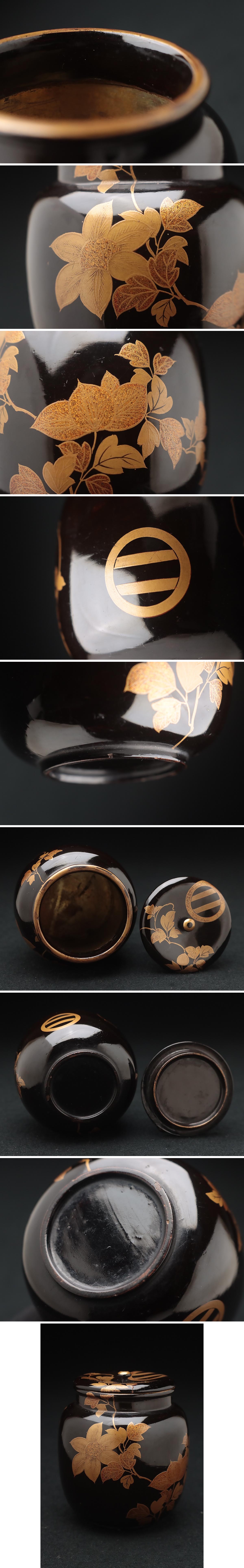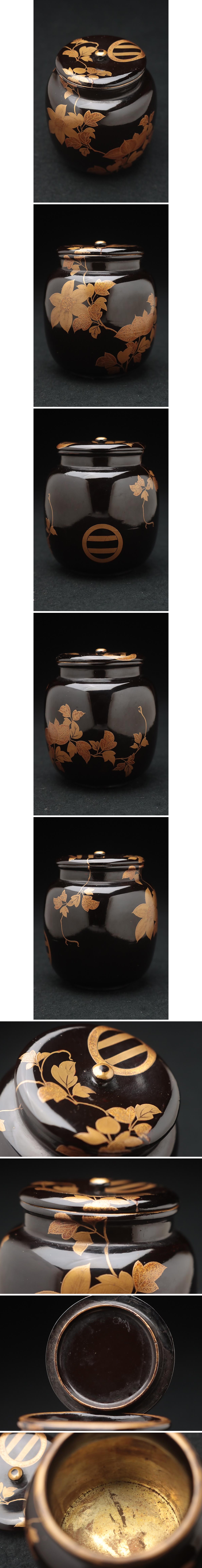 | ◆ 時代漆器 定紋入 鉄線金蒔絵焚殻入・鉄仙蒔絵蓋付香炉 高8cm 茶道具 香道具 漆工芸 古美術 ◆