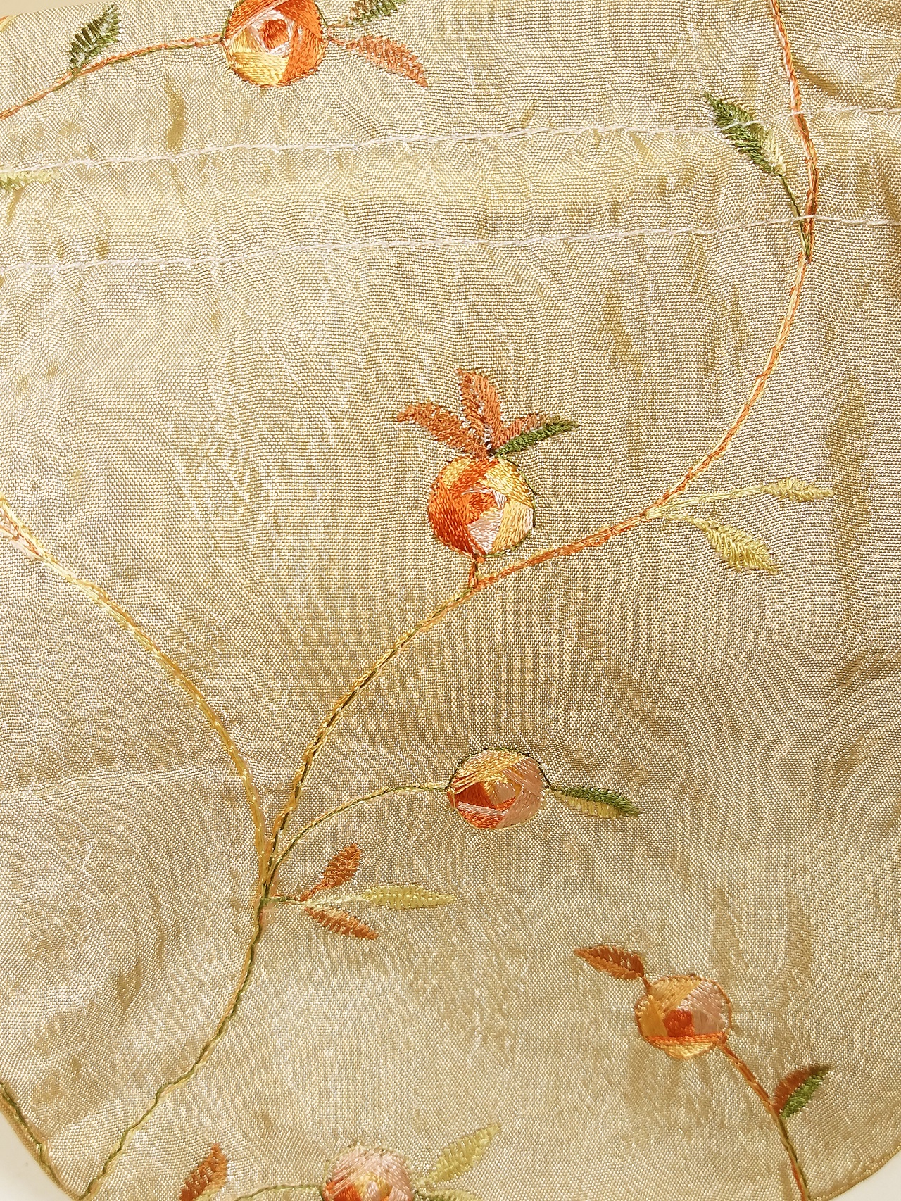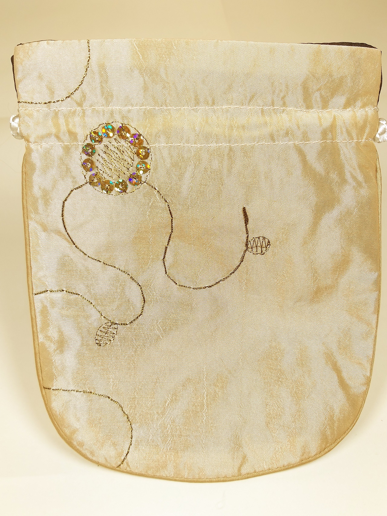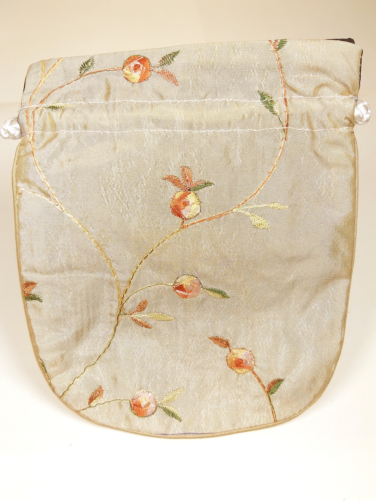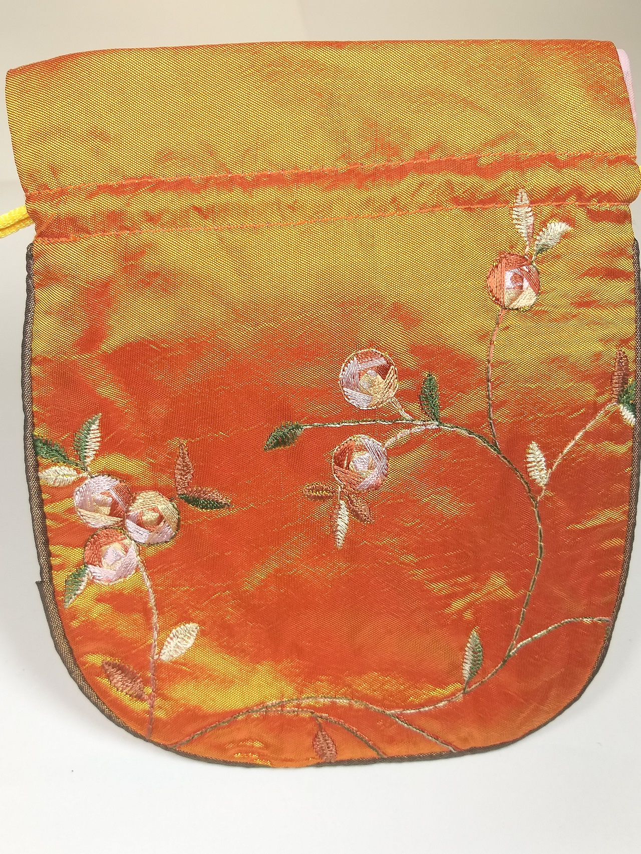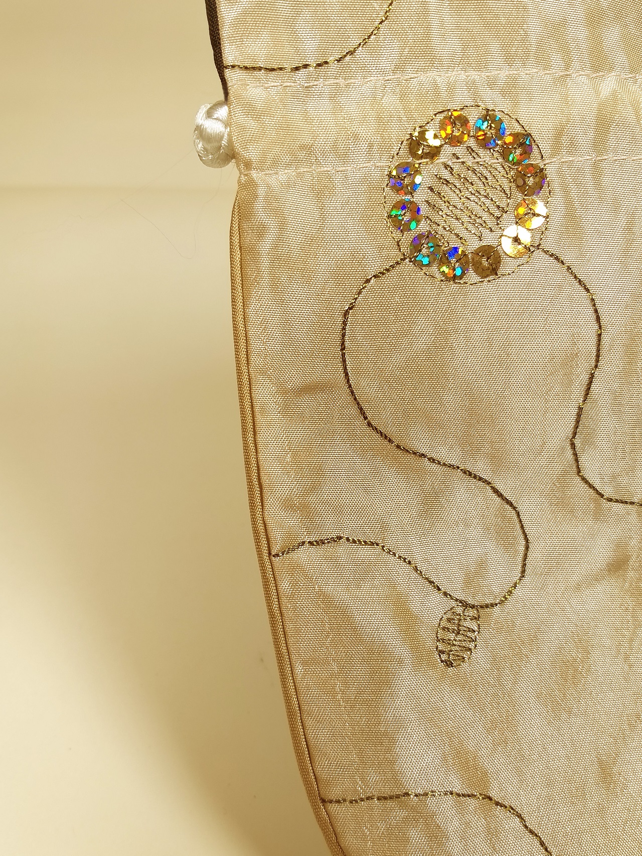 この種の巾着の外側生地は、シルク製で、たいへん綺麗な両面立体金線刺繍・七彩虹色スパンコールが施されております。内布は、ナイロン生地製で、製作は、全てが手工芸によるものです。