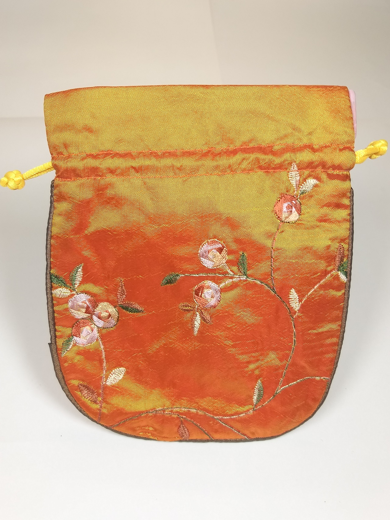 2.12枚目の写真をご覧ください。巾着は、正面は両面立体刺繍が施されており、13枚目の写真をご覧ください。裏面は金線刺繍に加え七彩虹色スパンコールで花模様が縫い付けられています。巾着は、正、裏面は金線刺繍に加え七彩虹色スパンコールで花模様が縫い付けられています(18種類の中の数種類は、片面加工の品になります)。