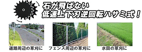 | 商品説明 | 石が飛ばない低速上下刃逆回転ハサミ式です お手持ちの刈払機に装着できる回転バリカンです。 凄い切れ味で雑草を根こそぎ刈ります! 土・石が飛散せず水際も跳ね返りがなく切れますので、道路キワ、水田の畦、市街地の草刈りに最適! 凄い切れ味 雑草を根こそぎ刈れます。水きわも跳ね返りがなく刈れます。 安全 上下刃逆低速回転ハサミ式で土、石が飛散しません。 取付簡単 どの機種にもご自分で装着できます。替刃の交換も簡単! (一部装着不可の機種もあります) 地面に置いて滑るように刈れます 替刃の交換が簡単!! ●用途 ・水際・路肩・平地の草刈用 ・高速道路・一般道側面の草刈に ・サービスエリア内の草刈に ・ガードレール、電柱周りの草刈に ・鉄道レール付近の草刈に ・家周辺、駐車場の草刈に ・公共施設、公園、運動場の草刈に ・工場内の草刈に ・河川敷、堤防の草刈に ・水田のアゼ、水キワの草刈に ・ビニールハウス局辺の草刈に ・農作物周辺の草刈に ・果樹、植木の根周りの草刈に ・小石の多い所の草刈に ・荒地、休耕田の草刈に ・学校、保育園、病院、公民館の草刈に ・ブロック、U字溝の草刈に ・フェンス付近の草刈に ・ゴルフ場の芝生刈りに |