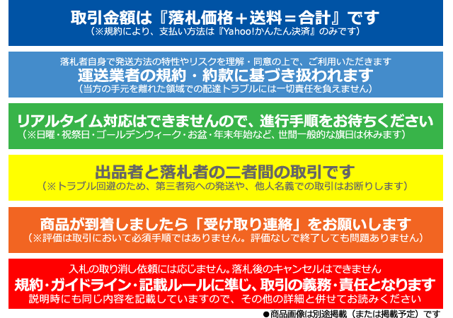●利用規約・ガイドライン・記載ルール等に準じ、取引の義務・責任となります。入札の取り消しや、落札のキャンセルはできませんので、よくお読みの上でご参加ください。