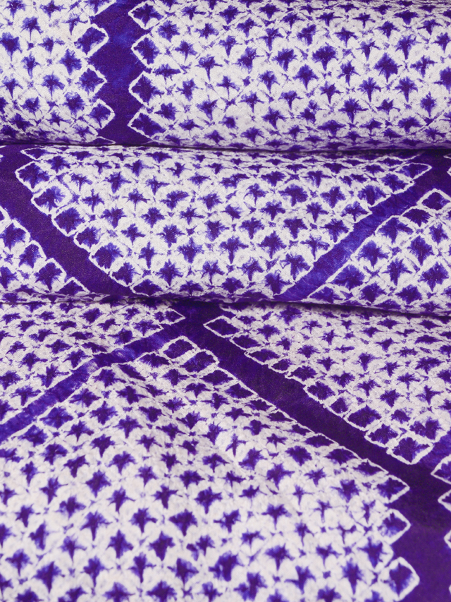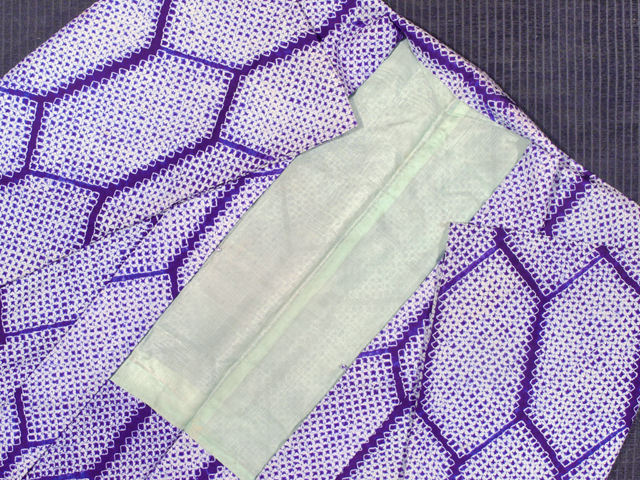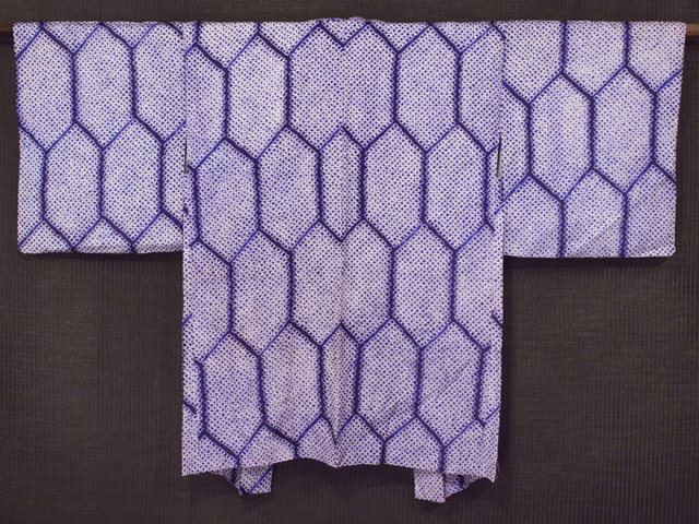 青紫色の地に、鹿子の総絞り染めで亀甲つなぎの文様があらわされている、羽二重の羽織です。袷仕立てです。 昭和初期ごろにつくられたと思われるアンティークのお品です。軽やかな羽二重地です。 しつけ付きの仕立て上がりのお品ですが、左前袖の袖山下に直径約 2-3cm のごくうっすらとした黄変が 2、3 か所、直径約 1mm の小穴が 2 か所あります。また、全体のところどころにごくうっすらとしたヤケ感が若干あります。いずれのダメージもあまり判別はつかず、そのほかに目につく大きなしみやよごれ、褪色などのダメージはありませんが、上記のとおり、小穴があるため、状態ランク=「D」のご着用対象外、リメイク素材用とさせていただきます。 |