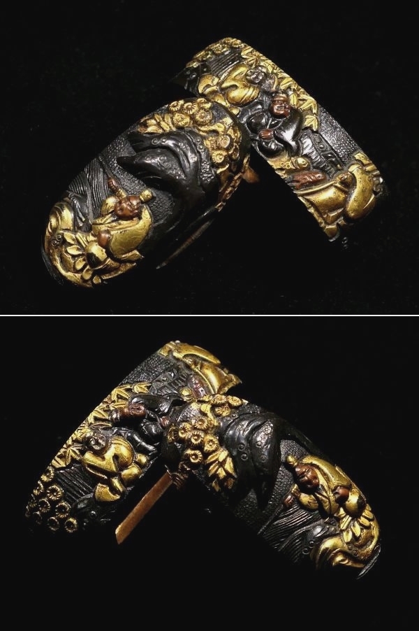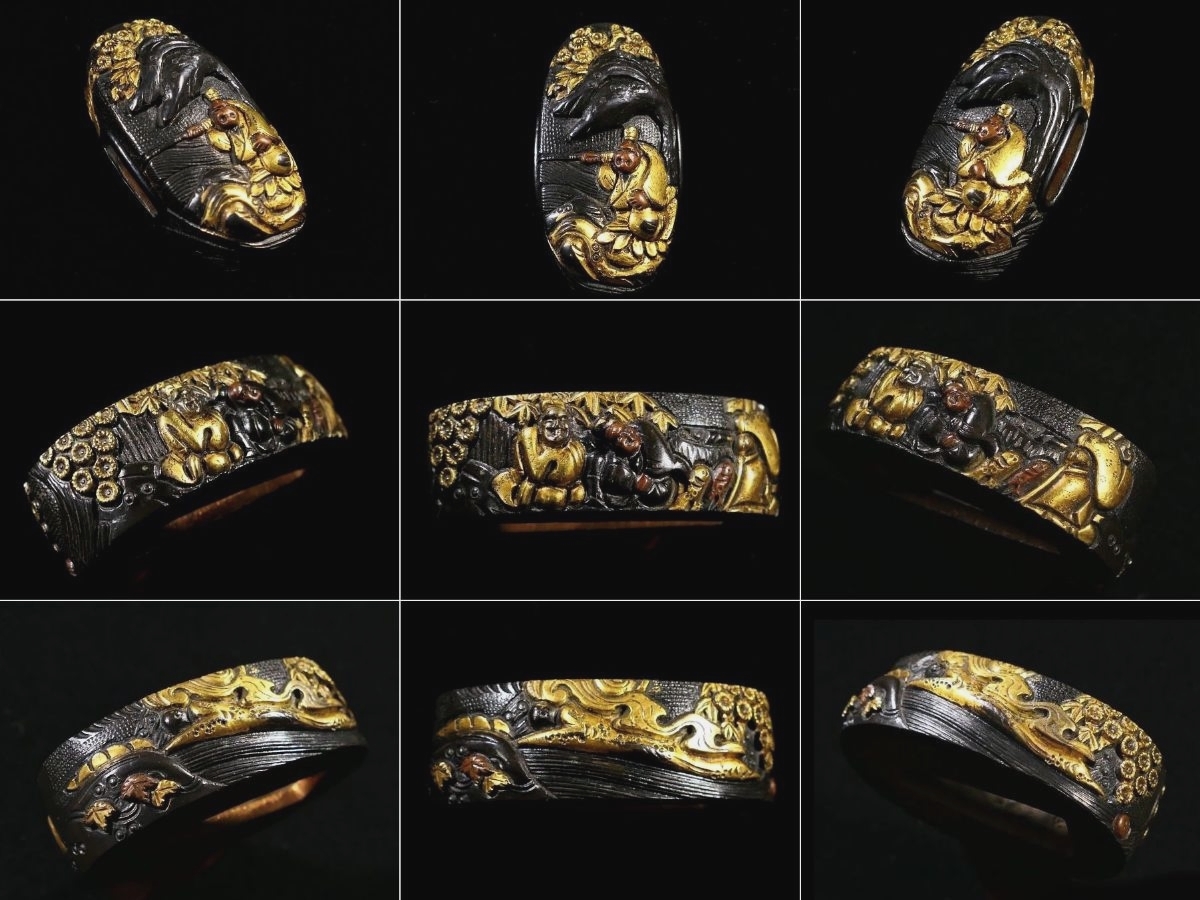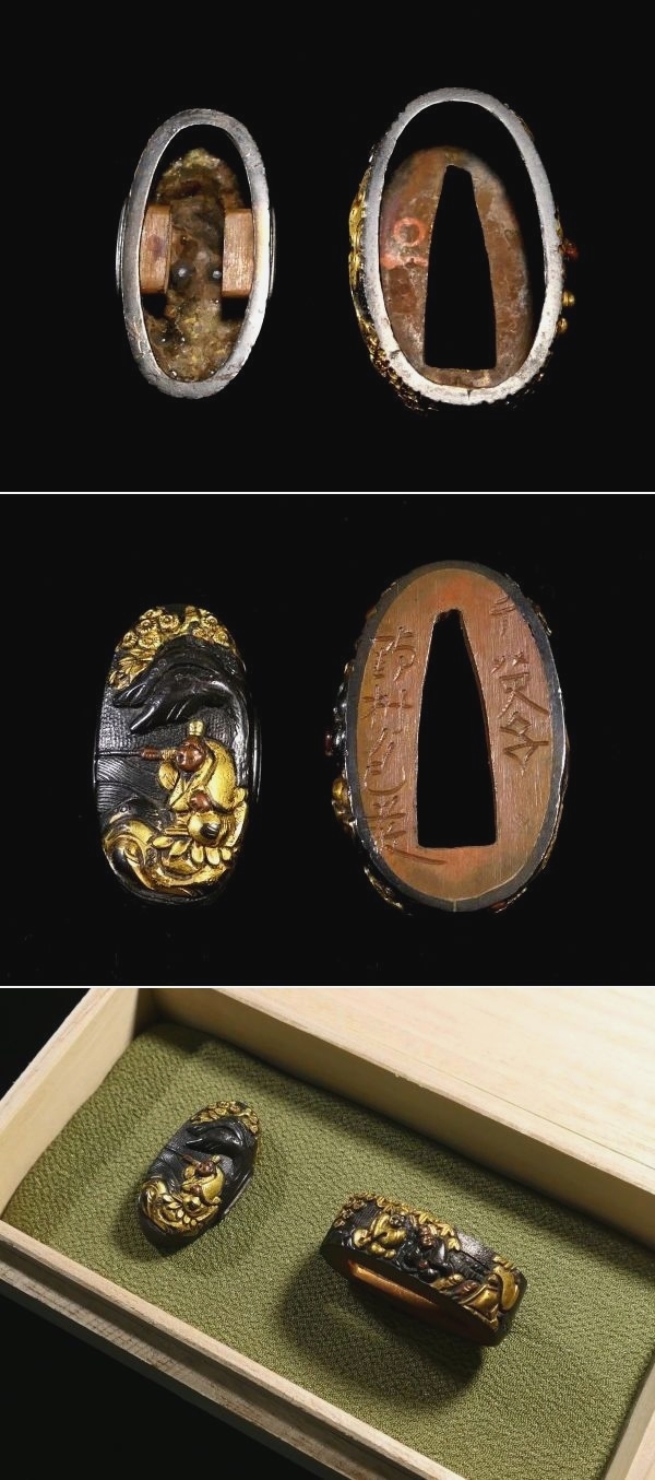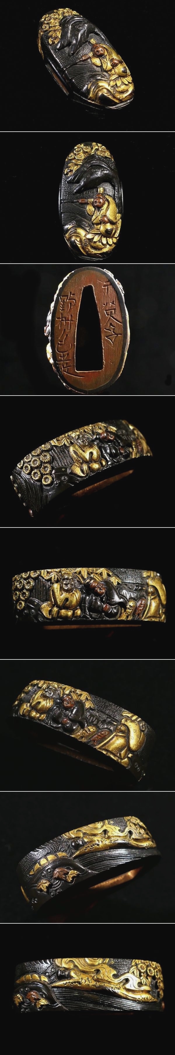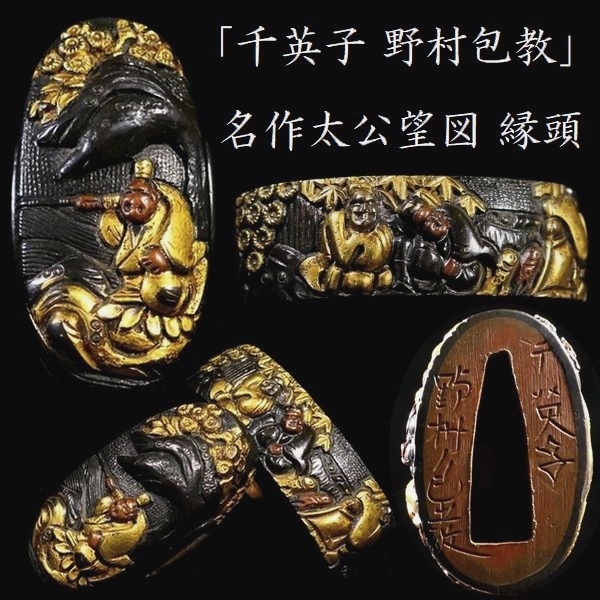 | 商品説明 | 華やかな金銅色絵に 繊細な細工技術により 見栄え良き太公望の図が施された 「千英子 野村包教」在銘の作品です。 盛り上がった高彫細工が 見応えある作品であり 観賞用にも拵え用にも 幅広く活躍する一品と存じます。 この機会に是非手に入れて下さい。 【華やかな金色絵】 【見事な高彫り細工】 【拵え栄え抜群の一品】 寸法: (縁) 約 3.80cm × 約 2.30cm × 約 1.17cm (厚み) (頭) 約 3.41cm × 約 1.64cm × 約 0.88cm (厚み) 時代: 江戸時代 材質: 赤銅魚々子地 桐箱付 銘 : 千英子 野村包教 状態:特に気になる傷みはなく良好。画像にてご判断下さい。 :許容範囲内の時代傷みはご理解下さい。 |
