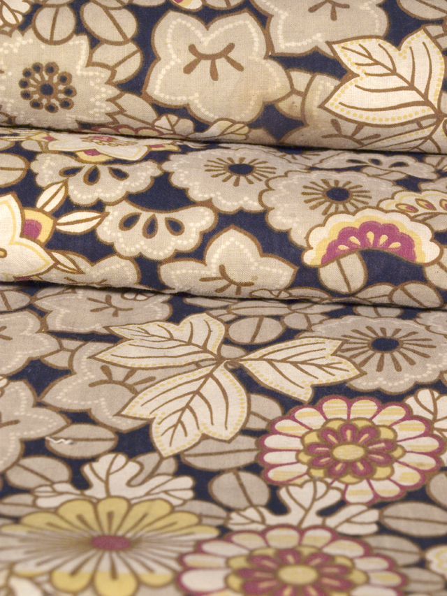 黒紅色の地に、桜や撫子(なでしこ)、桔梗(ききょう)、萩、菊などの草花の文様が染められている、綿の和更紗のはぎれです。 昭和初期ごろにつくられたと思われるアンティークのお品です。さらりとした手ざわりの綿地です。 画像のとおり、下端から約 67-100cm の範囲に長さ約 3-7cm の裂けが 8 か所ほどあるほか、上端から約 42cm の中央右に直径約 1cm の小穴が 1 か所あります。全体のところどころにこまかなうすよごれがちらほらと、耳にこまlかな切れ目が若干ありますが、そのほかに目につく大きなダメージはありません。生地の力もあります。※風楽の出品内で同じ柄のものを複数出品している場合もあります。 |