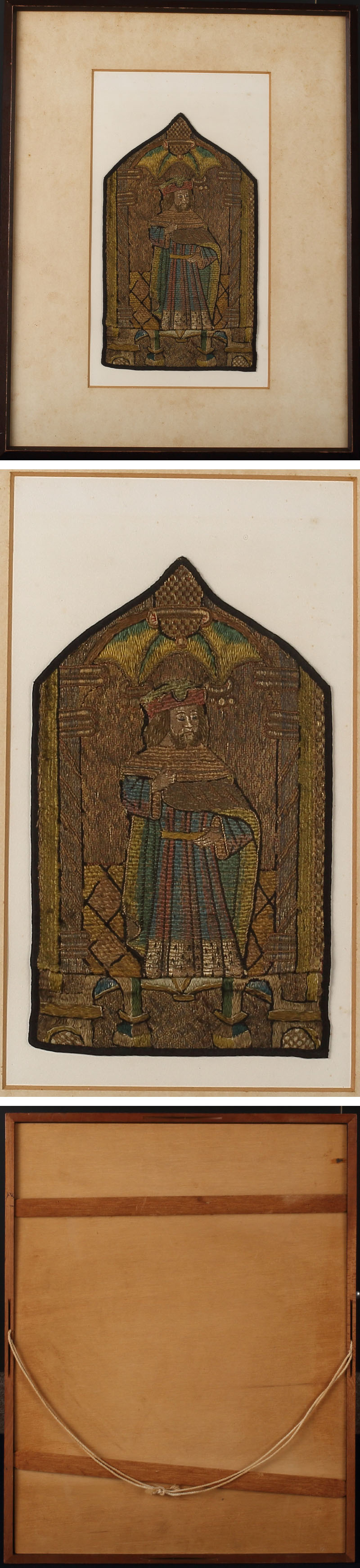 15世紀イングランドの刺繍です。 オーフリーは金モールや絹糸を用い磔刑図や聖人の姿を編んだ絢爛豪華な刺繍で、聖職者がミサの際に着用する貫頭衣であるカズラ(チャズブル)に好んで用いられました。古代フリュギアを由来とするとされるこの刺繍技術は、中近東・イタリア・シチリアなどを経由しアングロサクソン古来の金刺繍と融合し、チューダー朝初期のロンドンで隆盛を極め、「ゴールドワーク」と称され王族に愛されました。 本作は聖職者が教会暦に従って着用した緑色のチャズブルの断片と見られ、アレクサンドリアの聖カタリナ(11月25日)や聖アシスクルス(11月17日)とともにオーフリーの意匠に用いられることがある、リエージュの聖フベルトゥス(聖ユベール、11月3日)が像主とみられます。緑色のチャズブルは年間を通じて着用されますが、文字を読めない信徒に向け、待降節(アドベント)に近い記念日を持つこれらの聖人が特に図像として選ばれ、断食などの儀式への準備を呼びかけるために用いられたと推察されます。 英国ではその後宗教改革や清教徒革命で修道院が破壊され、中世の刺繍の大多数が失われ、栄華を誇った刺繍技術もフランスなど海外に流出することとなりました。時代の変転を見届けながら、往古の輝きを今なお宿す貴重な逸品です。 ◆聖フベルトゥス マーストリヒト,のちリエージュの司教で聖人。伝説によれば,世俗の貴族であったが,復活祭の日に狩りに行ったところ,一頭の鹿の角の間に十字架を幻視し改心したという(古代ローマの殉教聖人エウスタキウスの同様の伝説からの借用)。以後アルデンヌ地方での布教に努めた。狩人・山林官などの守護聖人で、狂犬病を鎮めるとされる。美術作品では,犬や鹿を連れた狩人または司教としてあらわされ、伝説から十字架を幻視する場面、司教に就任する場面などが表現される。祝日は11月3日。 付属:額縁が付属します。 寸法:額縦53.5cm、横42cm、本体縦29.5cm、横17.5cm(最大幅。若干の誤差はご了承下さい) 状態:経年のイタミがございます。 |