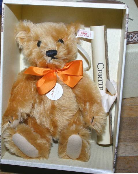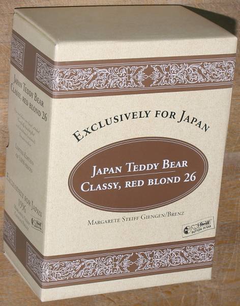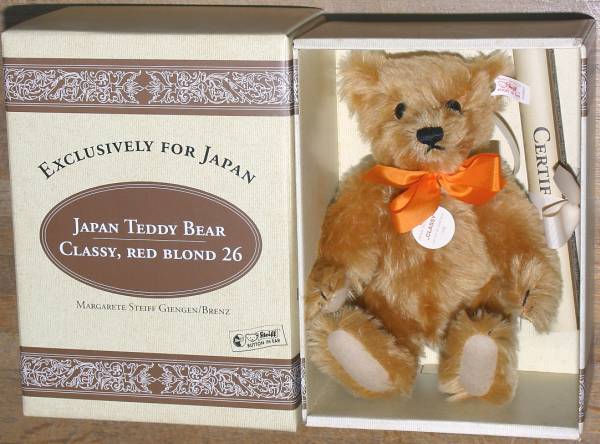 ドイツの最高級ぬいぐるみのブランド、シュタイフ社製、クラッシー テディベア (Japan Teddy Bear Classy, Red Blond 26cm 1996 #659867)。白タグ。日本3000体限定。全長約26センチ。箱、証明書付き。中古品。本体、若干、経年のくすみがあるように見えます。箱にスレ、カビしみ、薄汚れがあります。証明書はロール状で保管していましたので、巻きジワがあります。タバコは吸いませんが、長期の自宅保管のため、説明以外にも当方が気にならない程度の劣化、くすみ、汚れ、匂い等があるかもしれません。神経質な方は入札をお控えください。お支払いはヤフーかんたん決済のみ。東京発、ゆうパック持込80サイズ(東京1010円 - 沖縄1690円)、または定形外郵便(追跡番号、保険無し)920円での発送となります。(上記の送料はこの出品物のみの料金となります。複数落札、同梱包発送の場合、重さ、サイズが変わりますので送料が変わります。)3日以内のご連絡、かんたん決済の支払期限内(通常5日、支払方法により異なります)のお支払い厳守でお願いします。入札される前に「自己紹介」もあわせてお読みください。検索用ワード マルガレーテ・シュタイフ Steiff テディベア Teddy Bear| 出价者 | 信用 | 价格 | 时间 |