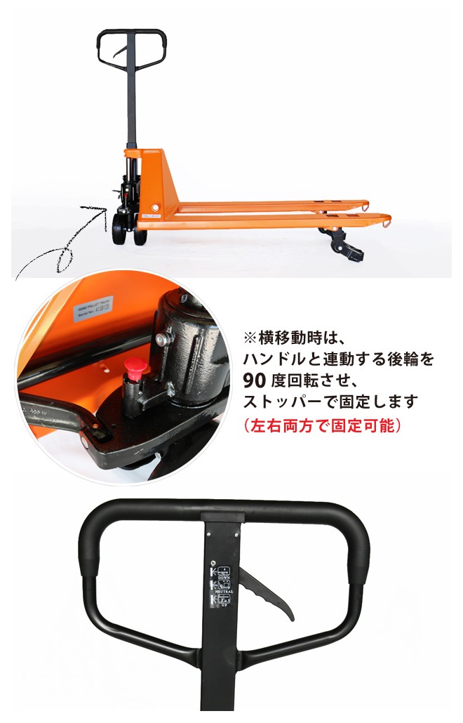 ●前後移動/横移動の両方が可能な、横移動兼用ハンドパレットです ●前後移動用と横移動用のローラーがそれぞれ爪先についており、 フォークの高さを変える事で切替わります (フォークの高さを170mm以上にすると、横移動ローラーが接地して横移動が可能になります) ※前後移動と横移動は同時にはできません ●横移動時はハンドルと連動する後輪を90度回転させ、ストッパーで固定します(左右固定可能) ●積み荷のまま横移動ができるので、狭い場所での運搬に威力を発揮します ●長尺物の道路移動や、プラットホームからトラックへの積み込みなどに効果的に使用できます ●工業製品国際規格CEマーク取得の一級品です |