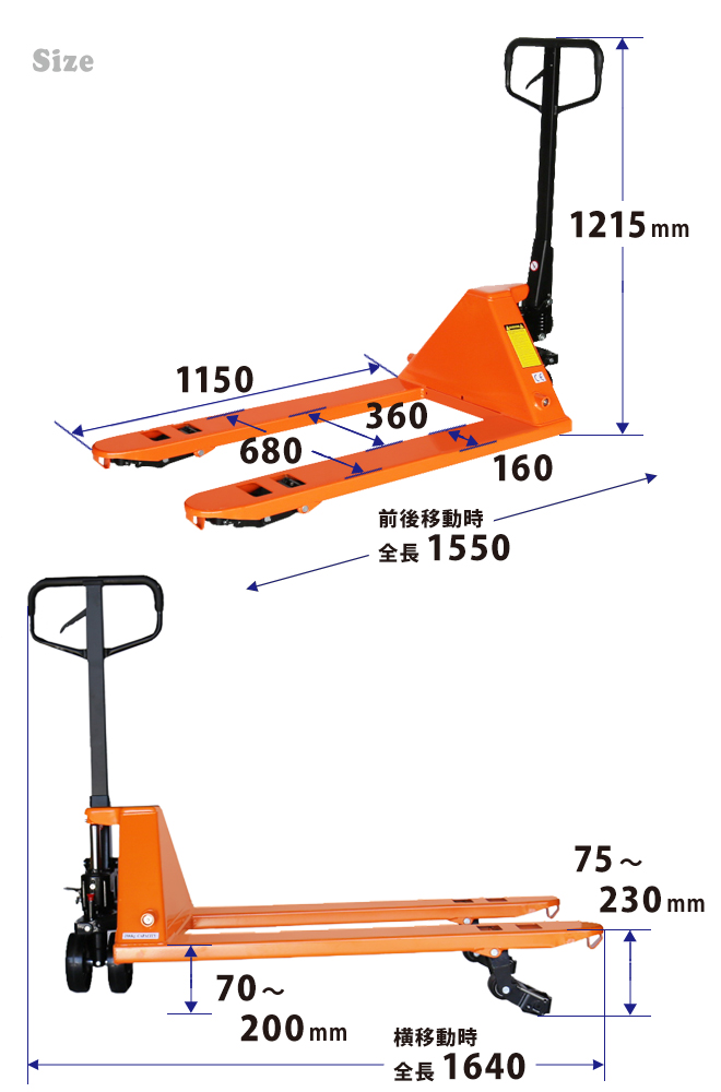 | サイズ | ・全長 前後移動時/1550mm・横移動時/1640mm ・フォーク長さ 1150mm ・フォーク全幅 680mm ・フォーク爪幅 160mm ・フォーク間 360mm |