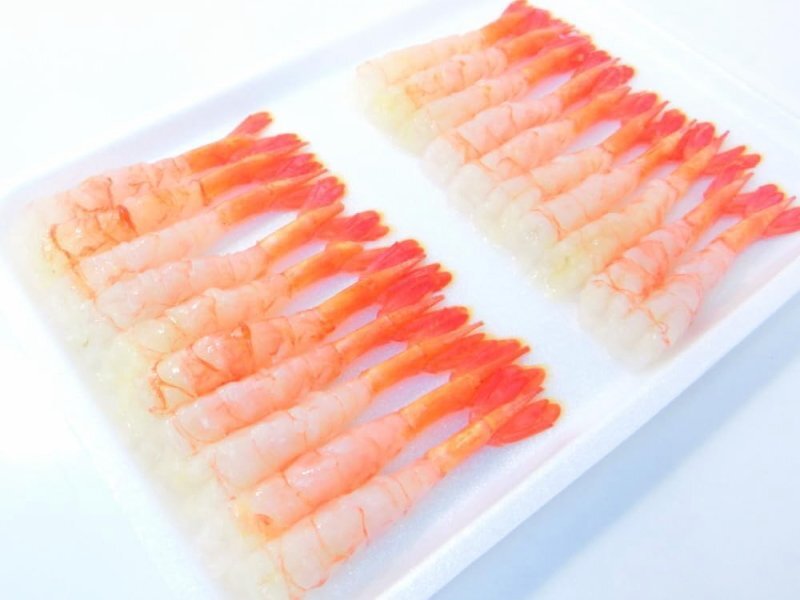 新鮮な甘海老を、尾を残し殻を剥いた業務用商品です。