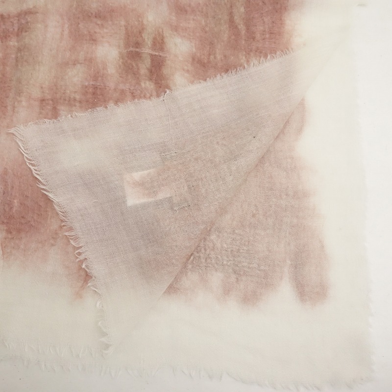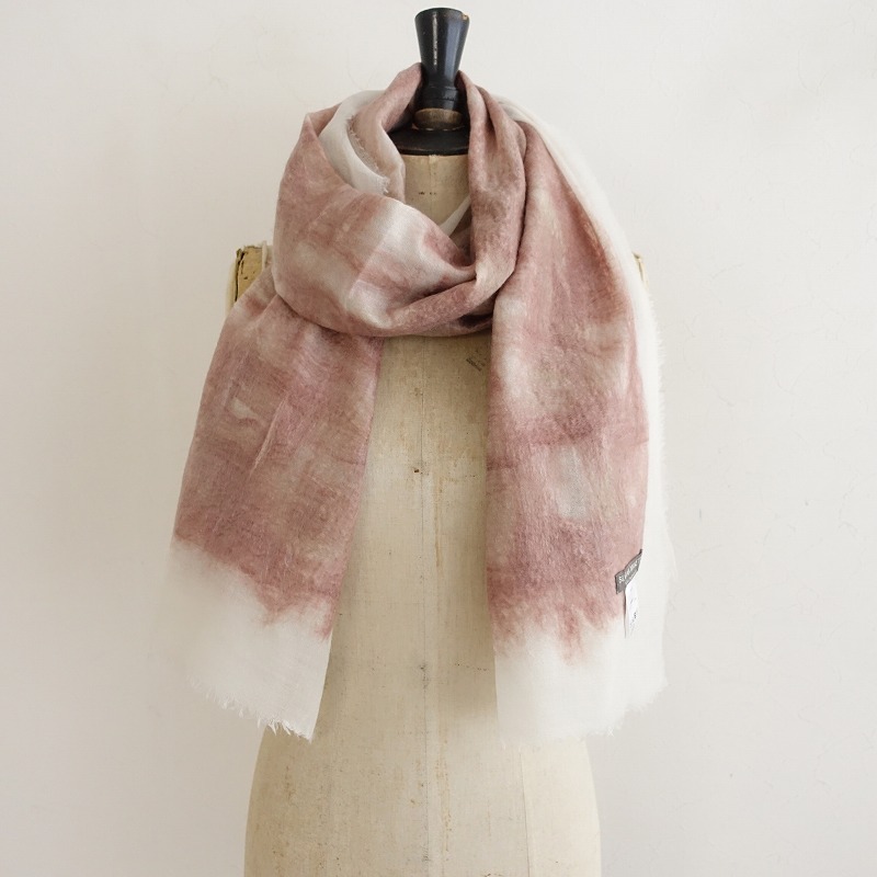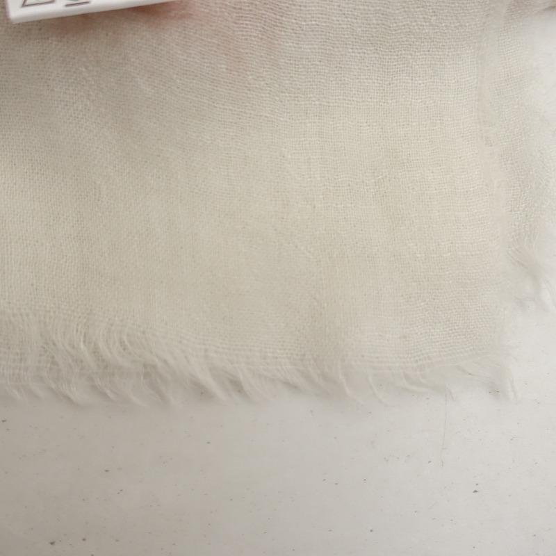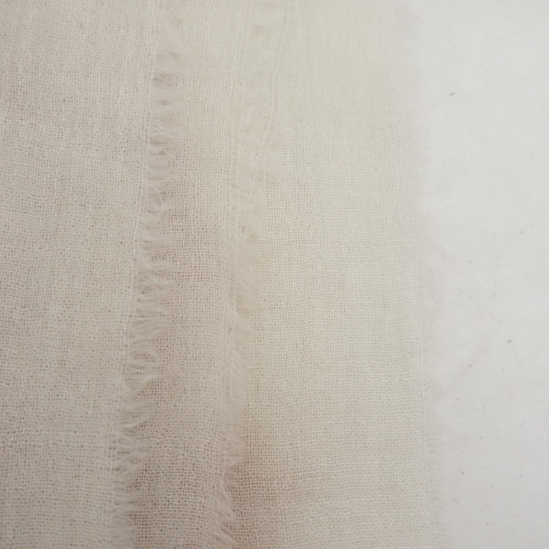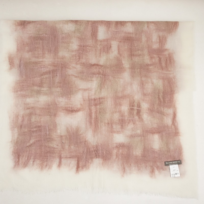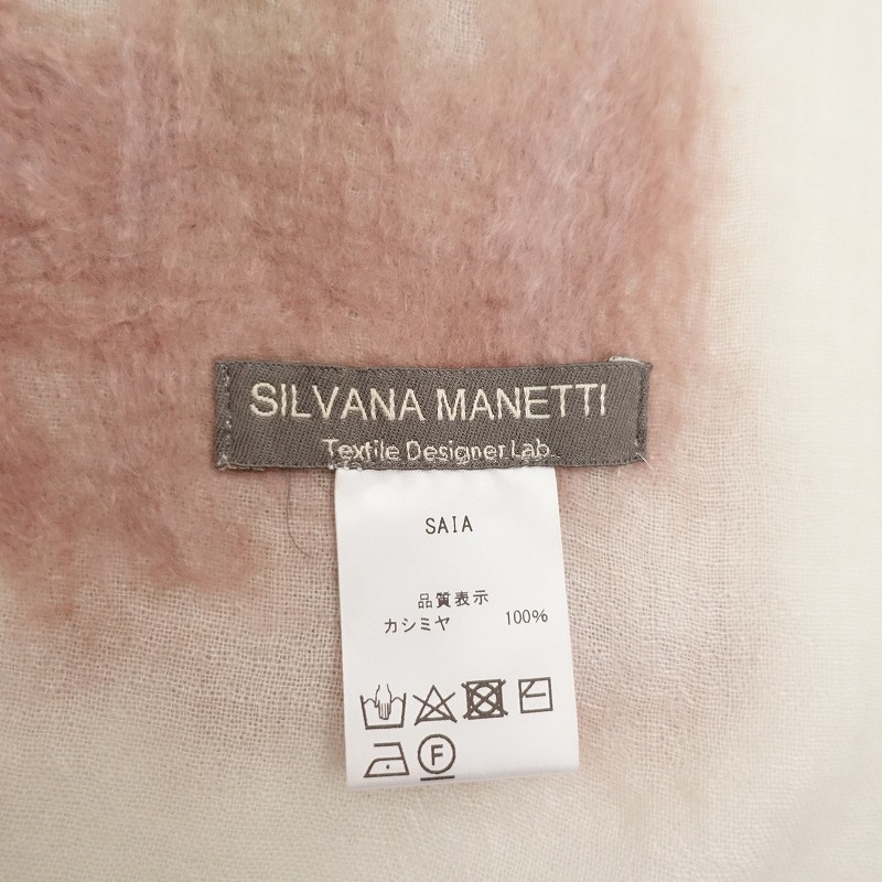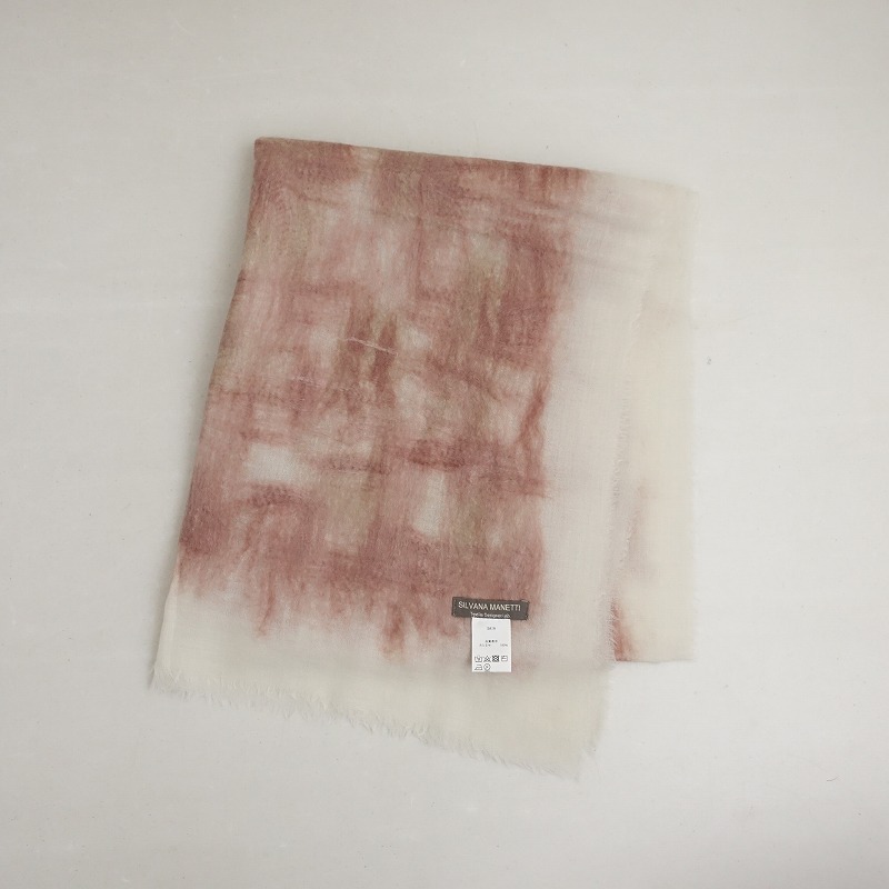 | SILVANA MANETTIのSAIA カシミヤストールです。カラーはアイボリー×ピンクブラウン系で、カシミヤ100%の柔らかなガーゼのような薄手素材であしらわれており、布端は裁ち切りでフリンジのようになっています。定価(メーカー希望小売価格)66,000円の商品です。 |