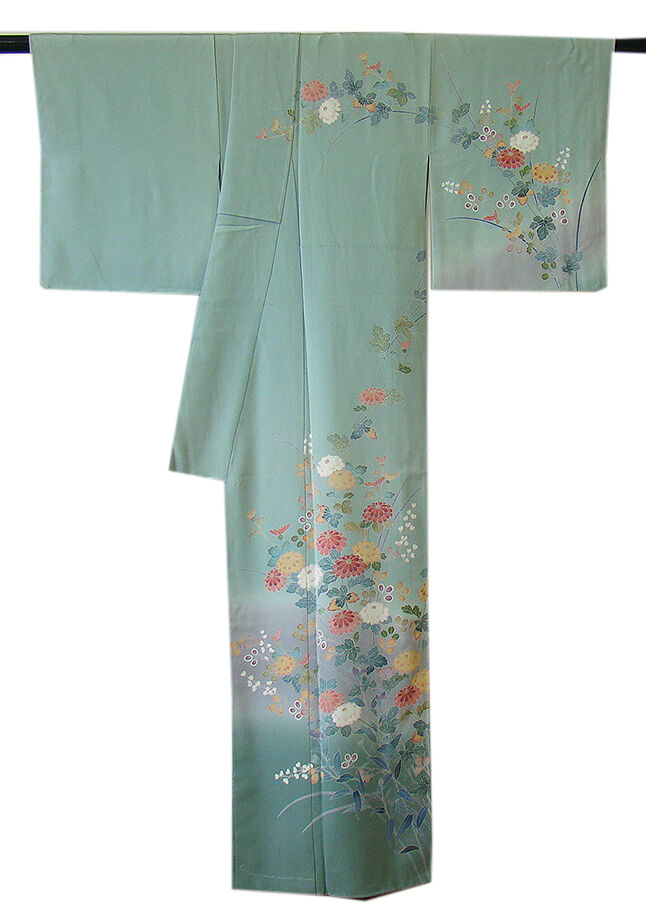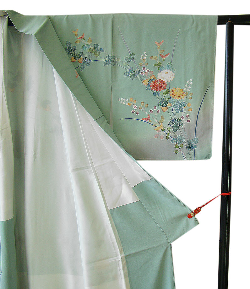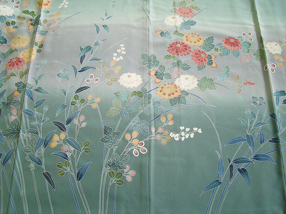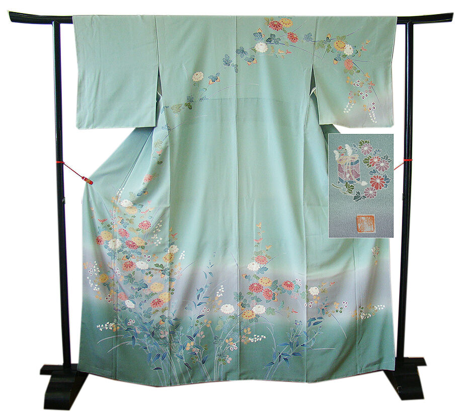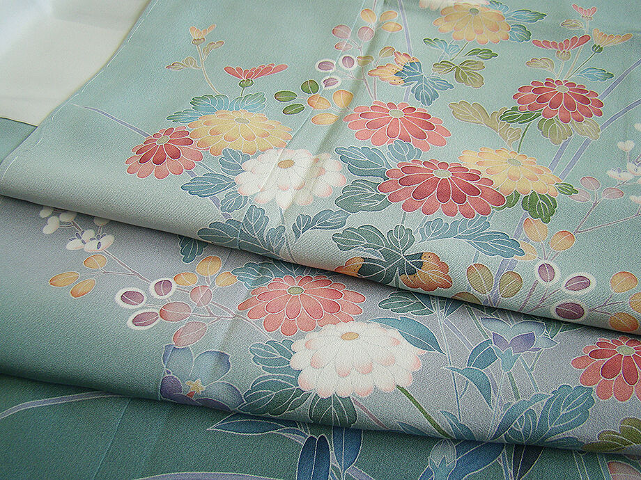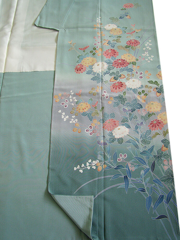 商品説明 | こちらのお品は「袷」ですので10月から5月までお召頂ければと思います。 とてもしなやかで柔らかな手触りの着心地良い重めの上質な極上ちりめん地の生地、 青磁鼠色地に裾にかけて千草色、灰色ぼかしに花木柄の本加工染、 気品に満ち溢れた彩りが正統派のお着物として一枚は欲しい逸品の素敵なお着物です。 八掛は共布に柄入り(正絹)、作家の落款入り、幅広い年代の方にお召頂けます。 |