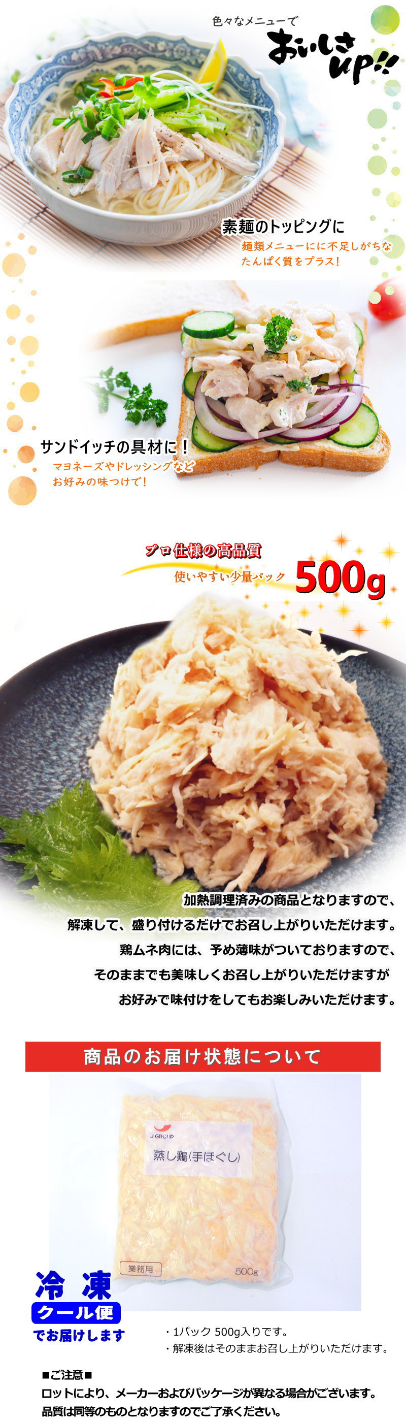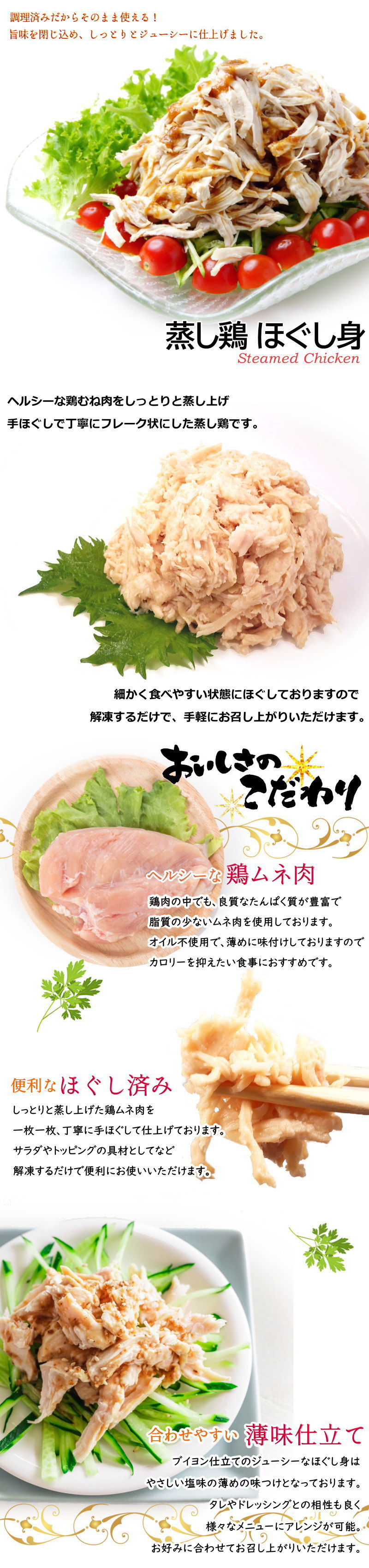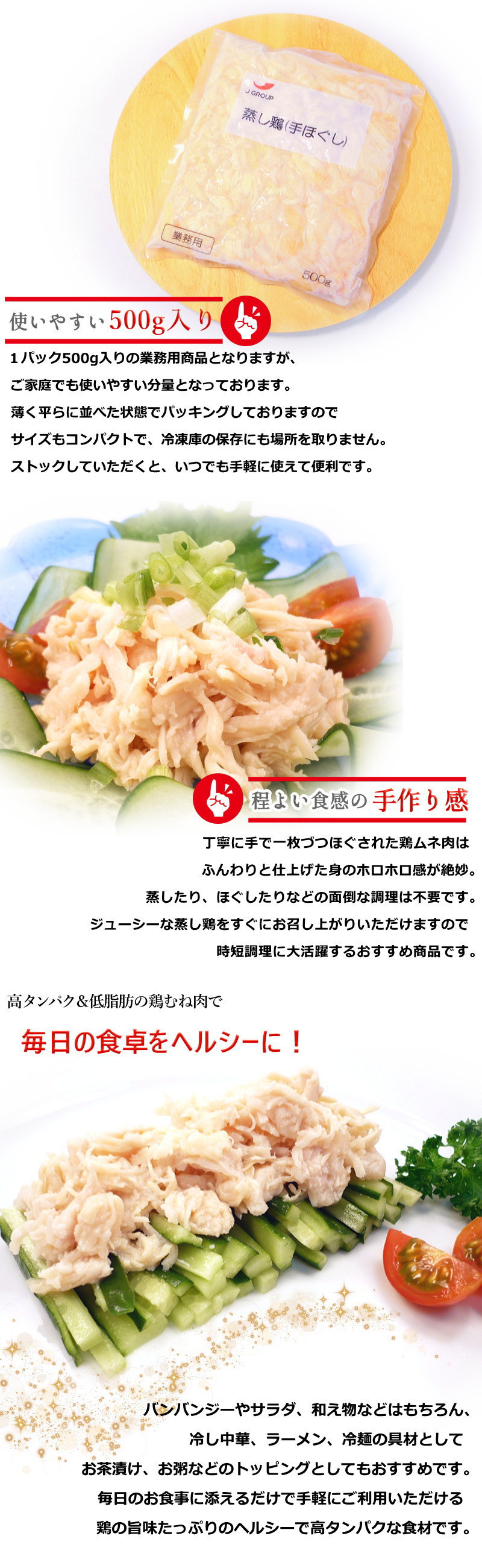 塩味で整えた鶏のほぐし身を500g入りパックにしました。