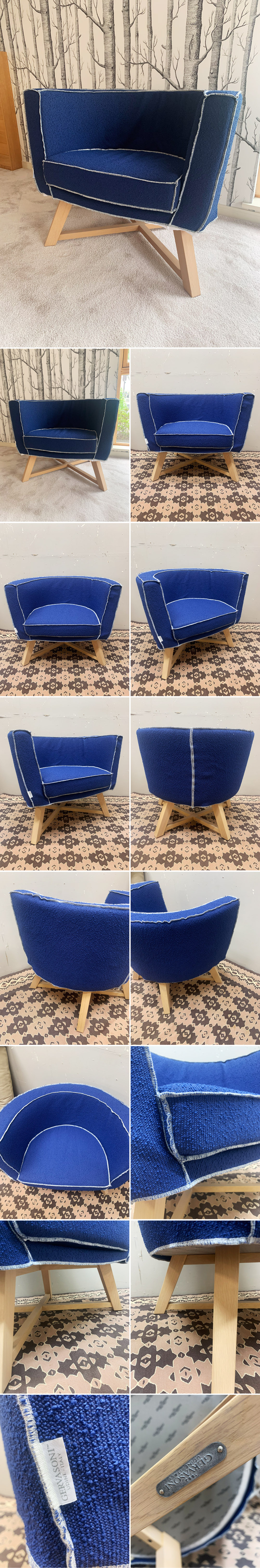 ほどよくルーズなパイピングのファブリックシートと、ウッドレッグを組み合わせたチェア。
