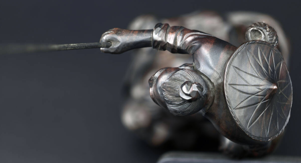 | 品名:漁夫・太公望像 縞黒丹 飾具 床飾 作家:日本製 寸法:本体丈≒20㎝ 総丈(竿含)≒34㎝ 土台面寸法 ≒9.5x8㎝ ≒515g 状態:ダメージのない堅牢で希少な黒丹を使った極美品の作品です。 できるだけ説明いたしますが、写真でご判断ください。写真の色の誤差はご容赦ください 出品者の主観です:堅牢な黒丹(縞のよく表れている素材)に 立体的に小疵なく太公望を彫り上げています完品・極美品です。 | ||
