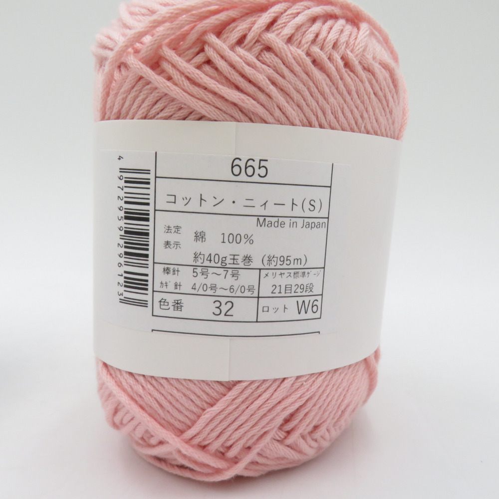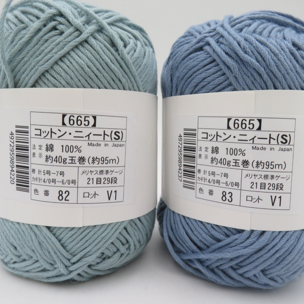 | 商品説明 | コットンニィートを少し細くした合太~並太タイプの「コットンニィート(S)」。 コットンニィート(S)は、マットでナチュラルな質感が人気。滑らかな糸は、するするっと編めて柔らかな編みあがり!ふんわり撚り合わせているのでギシギシせず快適に編めます♪ 品番:【665】コットンニィート(S) 色番号:10番×2、11番×1、32番×2、82番×2、83番×2 重量/糸長:約40g玉巻(約95m) 使用針:棒針 5号~7号 かぎ針 4/0号~6/0号 メリヤス編み標準ゲージ:21目29段 | ||