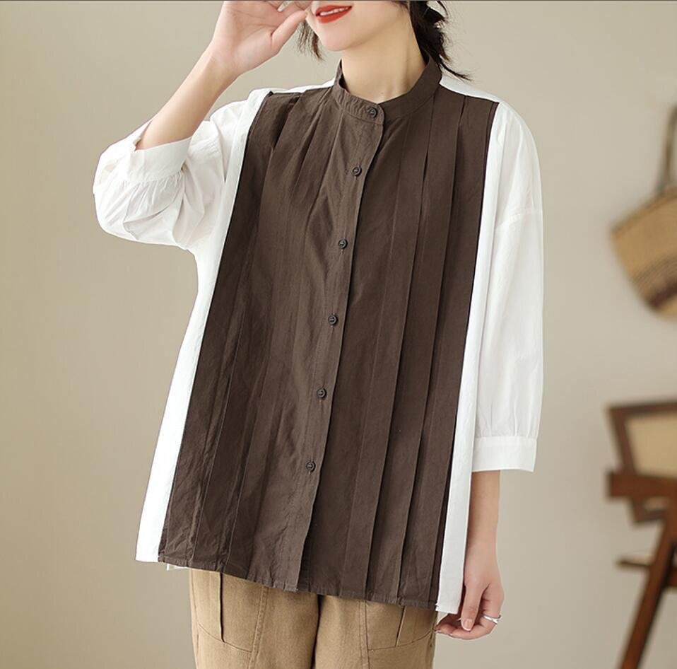 春夏 チュニック レディース コットン シャツブラウス 配色 トップス ゆったり 着心地 可愛い★白 /Mサイズ
