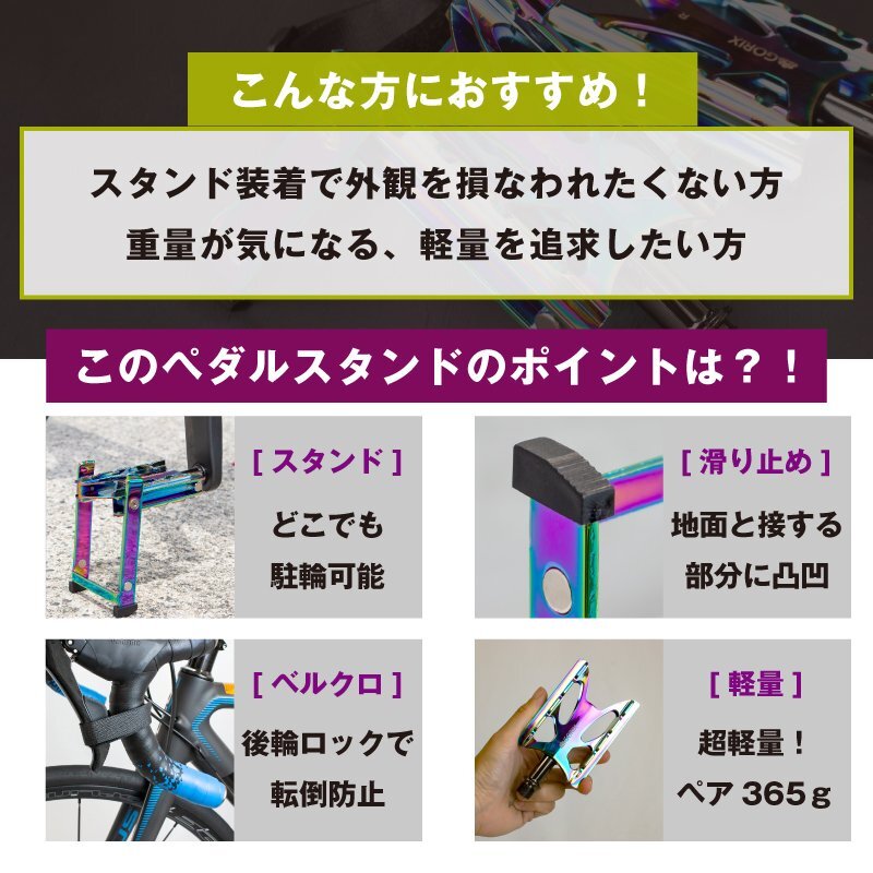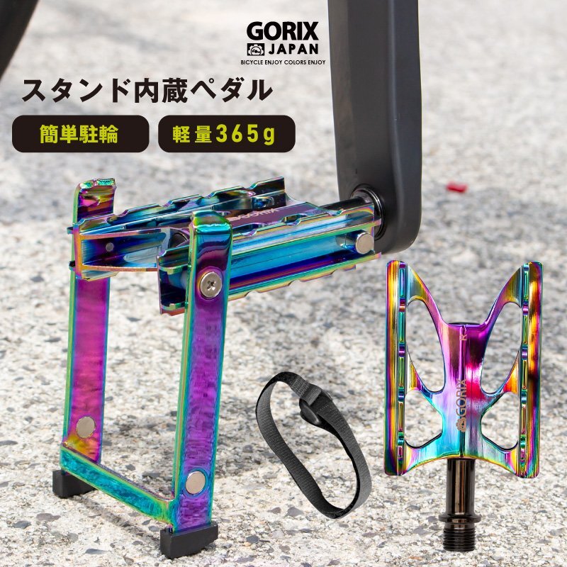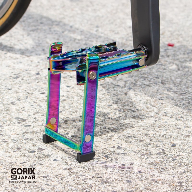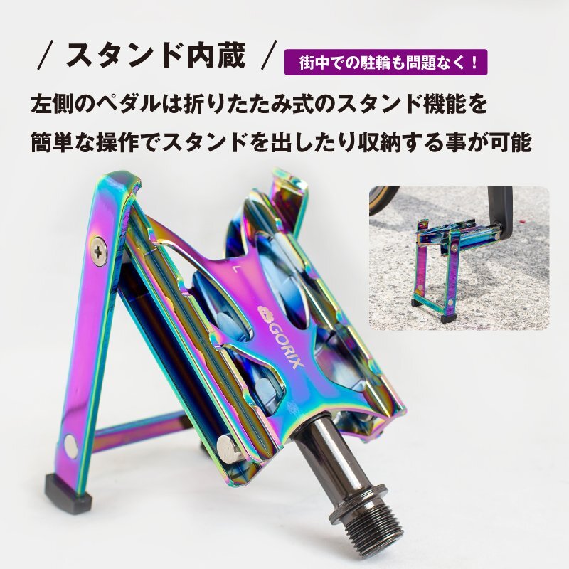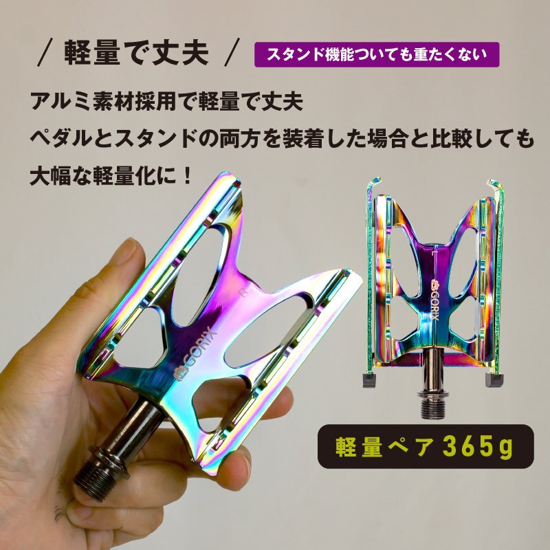 スタンド機能が付いている画期的な自転車ペダル。 既存GX-193から新しくオイルスリックカラーになって登場! 軽量を追求した車体にとって、スタンド自体の重量や衝撃による破損リスクの可能性。 何より自転車の外観にベターなスタンドを探す、苦労もあるでしょう。 必要不可欠な商品に、あれば便利な商品を組み合わせたのが、GORIXのスタンド内蔵ペダル。 壁や柱がない街中での駐輪も問題なく可能です。 自転車の外観を損なうことなく、スマートにそしておしゃれに。 オイルスリックカラーで足元のペダルから個性的なカスタマイズを応援します。 [スタンド内蔵] スタンドを装着する事で外観を損なわれたくない方&重量が気になる方におすすめ。 フラットペダルに折りたたみ式のスタンド機能を持ち合わさせた事によってペダルスタンドとしてお使い頂けます。 簡単な操作でスタンドを出したり収納する事が可能です。 [オイルスリック] 個性的で魅惑のカラーで人気の高いオイルスリック。 カスタマイズ性も高くワンポイントのアクセントにも最適なカラーです。 [軽量] ペダル本体もペアで超軽量の365g!スタンド機能が付いてても重たくない。 アルミ素材採用で軽量で丈夫。 ペダルとスタンドの両方を装着した場合と比較しても大幅な軽量化に! [美しい造形] 無駄な部分は肉抜き加工を施し、見た目もスッキリとした印象に。 アルマイト加工で傷や摩耗にも強い。 [簡単設置・収納] 簡単にスタンド部分を取出す事が可能で発進時も簡単に収納できます。 煩わしい作業はしなくてスムーズにお使い頂けます。 [ベルクロテープ付きで転倒防止] 後輪のブレーキロックをすることにより、クランクを固定します。ペダルの位置も固定され転倒防止に。 付属のベルクロテープを必ずご利用ください。 [カジュアルに] 自転車通勤・通学や街乗り、ツーリングにマルチに使える。 六角レンチ(6mm)で交換可能なのでペダルの取り付けも簡単に。 (※ペダル取付け時は固結防止のためグリスを塗布する事をおすすめします。) 9/16インチのネジ径で、主に一般車、電動自転車、ロードバイク、マウンテンバイク、クロスバイク、一輪車など ほとんどの自転車に採用されています。 商品内容ペダル左右セット、ベルクロベルト サイズ長さ88x幅63.8x厚み最大22mm、軸長64mm 軸径標準9/16インチ(ネジ径 約14.3mm) 重量約365g/ペア 材質アルミ合金本体、クロモリ鋼軸 ベアリング1DU+1ベアリング カラーオイルスリック ※使い始めのペダルは回転が渋くなっている事がございます。特に冬場は内側のグリスが硬くなり、通常より渋くなってしまいますが ご使用されるうちに馴染みが出て軽くなります。 商品は入荷によりキズがある場合があります。 傷や細かい汚れが気になる方や神経質な方は入札をお控え下さい。 入荷時期により予告無く一部仕様変更する場合が有ります。 カラーはディスプレイ種類環境等により実物と異なって見える場合がございます。 |