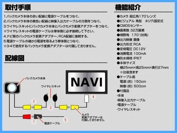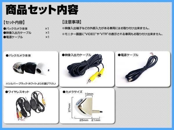 | ・バックカメラ本体 × 1 ・電源・映像ケーブル × 1 ・固定用両面テープ × 1 ・固定用ナット × 1 ・ワイヤレスキット × 1 |