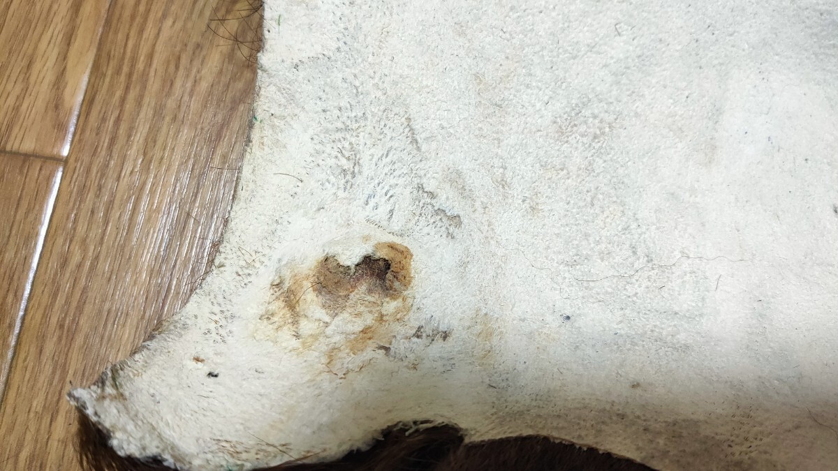 ●状態②●天然の毛皮を使用していますので個体差もあります。また毛皮特有の匂い、抜け毛、銃創、解体~鞣し作業時のキズ、穴、変色、縫合、その他接着剤による修正などある場合があります。 天然の毛皮につき皮の厚さも一定ではなく薄く破れやすい箇所もある場合もございます。丁寧な扱いをお願いいたします。使用による破れも返品はお断りさせて頂きます。ご理解の上で入札をお願い致します。画像で判断に苦しむ場合は質問下さい。