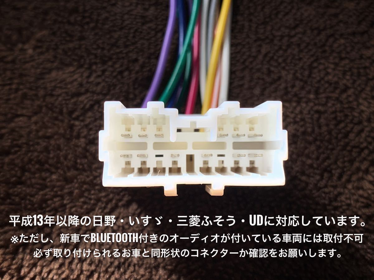 | 新品24V車用 トラックオーディオ簡単取付キット15Aデコデコ取付済 こちらの商品は、24Vのトラックやダンブでも簡単にオーディオを取り付け出来るように、DC-DCコンバーター(通称デコデコ)とトラック用の14ピンハーネスを接続しています。 純正のラジオかCDデッキを取り外し、背面のコネクターを接続し、お手持ちの12V用カーオーディオ(デッキ)の同じ色の配線同士を接続するだけです。 誤配線のリスクがないので安心です。 乗用車のオーディオ取り付けをされたことがある方であれば、簡単に取り付けできると思います。 平成13年以降の24V車の日野・いすゞ・三菱ふそう・UD(日産UD)に対応しています。 ※なお、新型17スーパーグレートには対応しておりません。 ※新車でBluetoothが付いてるトラックはコネクターの形状が異なるため、対応しておりません。 国産車4社共に共通ですが、一部のお車でコネクター形状が違う場合がありますので、ご購入前にコネクターの形状の確認をお願いします。 純正2スピーカー車・4スピーカー車どちらにも対応しています。 動作は乗用車と同様、キーACCにて動作、キーOFFで電源が切れます。(バックアップ電源対応で、時計やメモリーも乗用車と同じく正常に動作します。) ※イルミネーション機能はありません。 -------------------------------------------------------- ・使用している部品は全て新品を使用しています。 ・デコデコはテスターにて12V前後に出力されているか確認しています。 ・車両に取り付けることを想定して、24V電源とスピーカーと手持ちのデッキを接続して動作確認をしています。 ご不明な点がございましたら、お気軽にご質問くださいませ。 -------------------------------------------------------- ※検索用 日野 いすず いすゞ 三菱ふそう UD 日産UD hino isuzu mitsubishi fuso プロフィア ギガ スーパーグレート クオン レンジャー フォワード ファイター コンドル デュトロ エルフ キャンター アトラス | ||