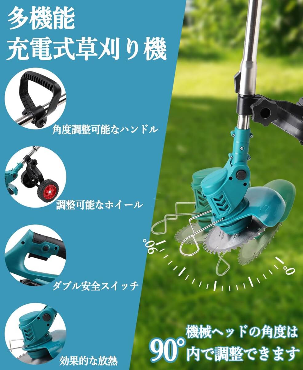 | 【大容量バッテリー2つ&高性能純銅モーター】この電動芝刈り機は、最高速度18,000 rpmの高性能純銅モーターを搭載しています。さらに、2,000mAhの大容量バッテリーを2つ搭載しており、充電60〜90分で最大3時間連続動作が可能です。雑草を効率的に除去するだけでなく、長時間稼働をサポートします。また、この草刈り機 充電式には過電流保護と短絡保護機能が備わっており、安全性にも配慮されています。庭にお役に立てます! 【4種類の多機能ブレード&組み立て簡単】草刈り機には、マンガン鋼の丸鋸刃、ステンレス刃、プラスチック刃、および草刈り糸の4種類の異なる刃が搭載されており、さまざまな除草ニーズに対応しています。ンガン鋼の丸鋸刃は、強力な切断能力を備えており、粗い低木の枝を切断するのに適しています。ステンレス刃は、芝生や小さな低木、農作物の迅速なトリミングに使用されます。プラスチック刃と草刈り糸は、柔らかい草や雑草のトリミングに最適です。製品の組み立ては簡単で、草刈機の商品ページに組み立て手順の動画がご覧いただけます。組み立てに問題がある場合は、ご注文履歴ページから弊社ショップにご連絡ください。 【伸縮式ポール&180°ハンドル調整&頭部90°調整】当社の草刈機は、人間工学に基づいた柔らかなハンドルを採用し、快適性とコントロールを向上させます。ユーザーの身長や腕の長さ、切断角度に応じて調整可能で、背中や腰への負担を大幅に軽減します。さらに、伸縮式デザインポールは90-120cmに調整可能で、ハンドルは上下0 - 180°に調整、草刈り機の頭部角度は0 - 90°の範囲で調整でき、あらゆる角や隙間も楽に手入れができます。伸縮式デザインポールでスペースを節約し、せまい空間でも移動や収納が簡単に行えます。 【脱着式ホイール&コードレス&軽量版草刈機】脱着式ホイール付き!芝生の上での草刈りをよりスムーズかつ簡単に行うために、取り外し可能な補助輪が付属しています。これにより、草刈り中に機械が安定し、操作が容易になります。さらに、補助輪を外すことで、より自由度の高い操作が可能になります。芝生の起伏や障害物があっても、この製品を使用すれば、迅速かつ効果的に草刈りを行うことができます。この草刈り機を使用することで、庭園の手入れが更に適切に行えます。資源と費用を節約し、線があるトリマーよりも静音でありながら、安全性と環境への配慮に優れています。加えて、ワイヤレスなので、電源コードの束縛から解放され、持ち運びも容易です。この草刈機の軽量設計により、軽快な操作が可能であり、長時間の使用においても腕の疲れを感じることはありません。そのため、高齢者や女性にも非常に扱いやすく、優れた利便性を提供します。 【セット内容&広幅用途】草刈り機の本体1台、チップソー3枚、スチールブレード5枚、ナイロンブレード10本、ナイロンコードカッター5本、2つの充電可能なリチウムイオンバッテリー、充電器1台、取り付け用ツール1セット、手袋一つ、保護メガネ一つ、そして日本語の説明書1冊が付属しています。4-IN-1草刈り機は、庭や茂み、畑、花壇、庭園など、さまざまな場所に適用できます。豊かな景観を創り出すだけでなく、庭の美化にも大いに役立ちます。L127 |