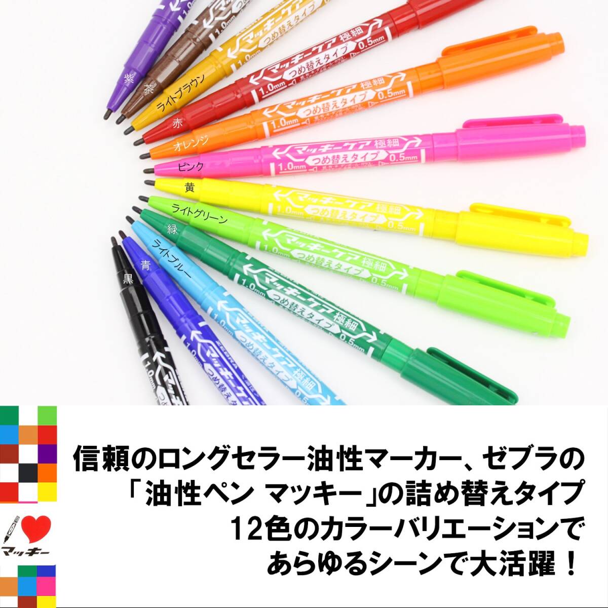 インクカートリッジが交換可能な油性マーカー「マッキーケア」。 経済的な油性マーカー。 黒・青・ライトブルー・緑・ライトグリーン・黄・ピンク・紫・赤・オレンジ・ライトブラウン・茶の12色セット。 一本で細・極細の両書きタイプ。油性アルコール系インク使用で、紙、布、木、ダンボール、金属、ガラス、プラスチック等幅広く使用できる。
