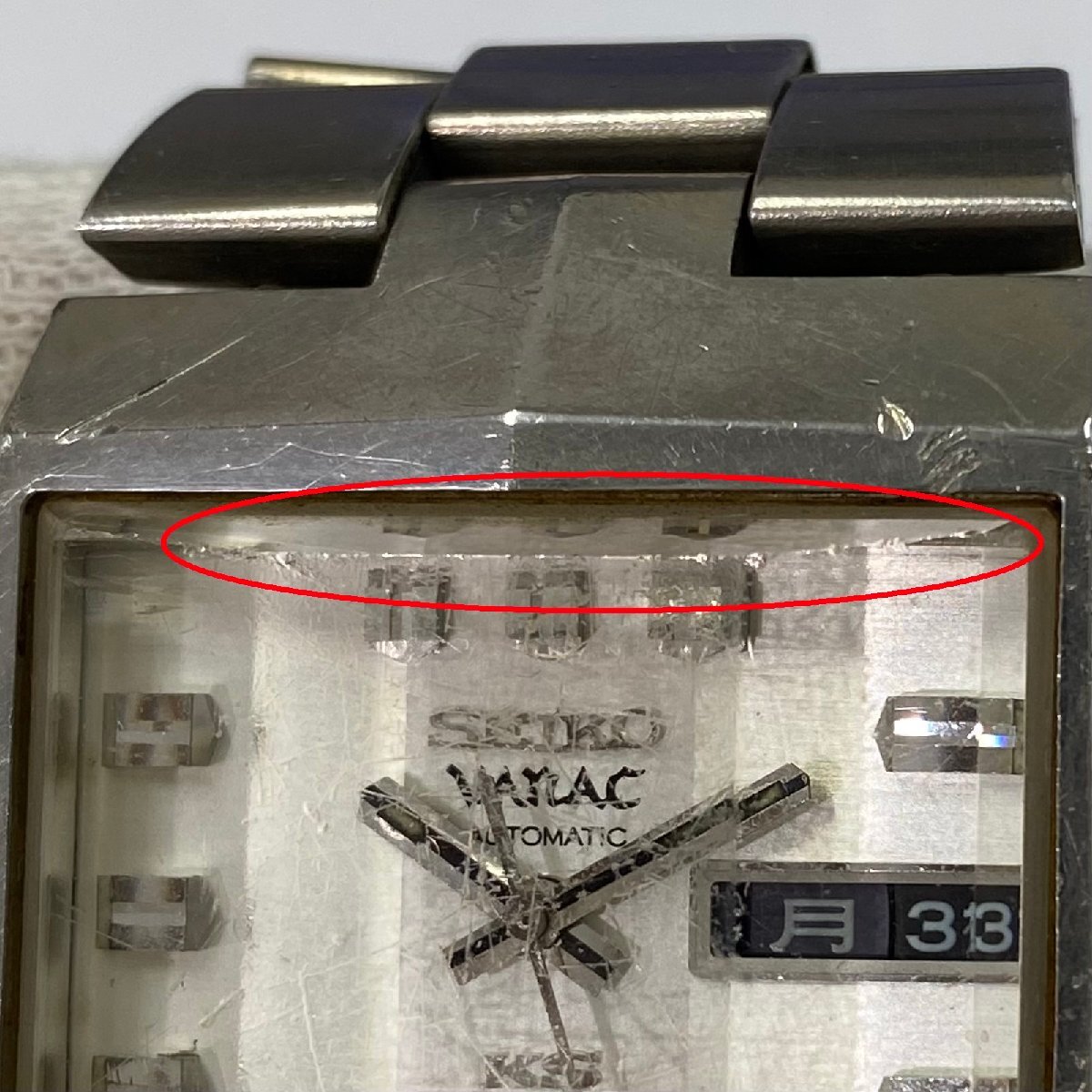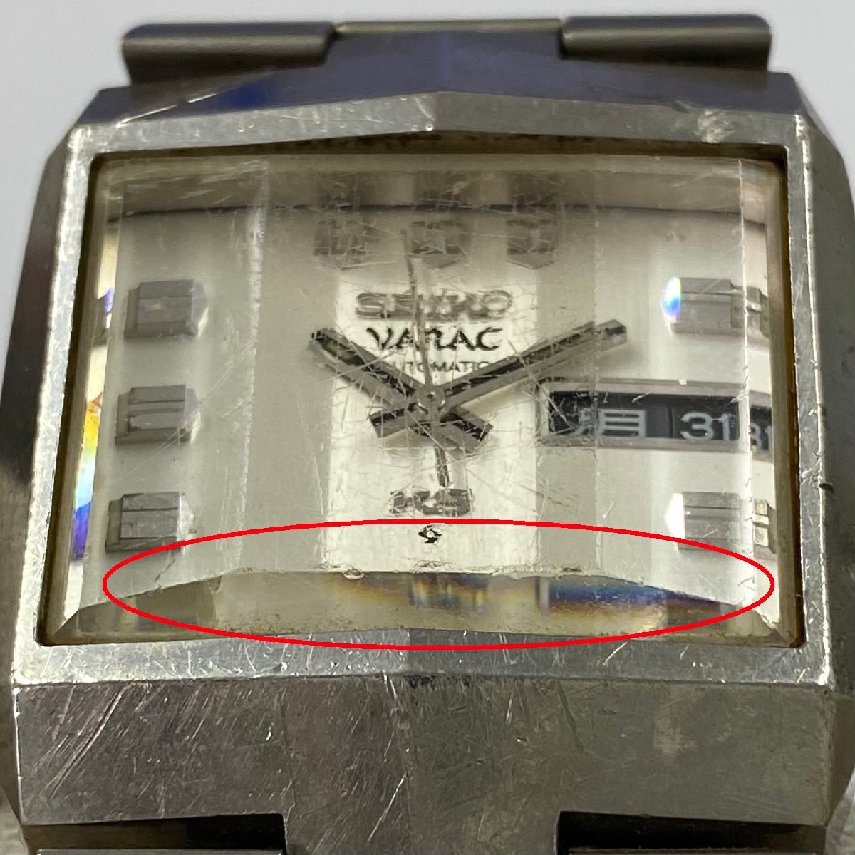 ・針やインデックスにくすみ、SEIKOロゴ周り/8-9時付近/縁に色剥げや黒ずみ変色