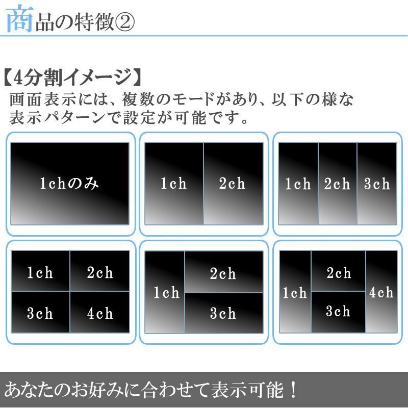 | 液晶サイズ:7インチ アスペクト比:16:9/4:3 映像入力端子:RCA4系統 映像入力切替機能:4ch共にトリガー(+電源)連動可能 定格電圧:DC12V / DC24V 本体サイズ:横180mm × 高さ120mm × 奥行20mm |