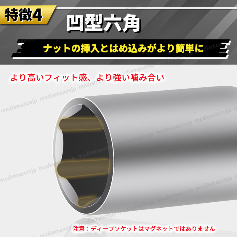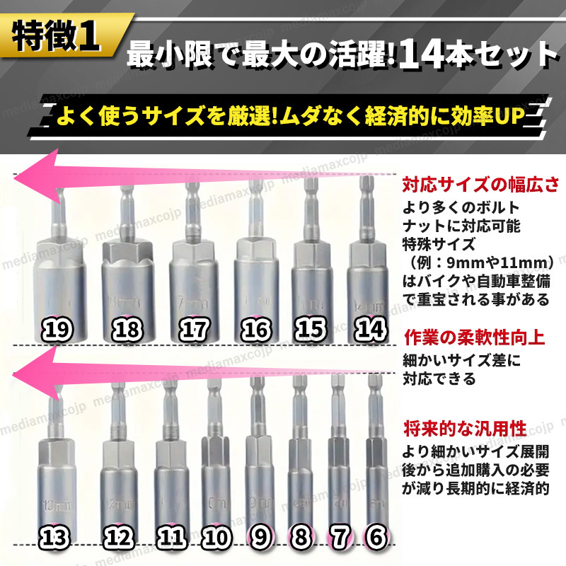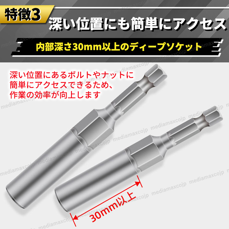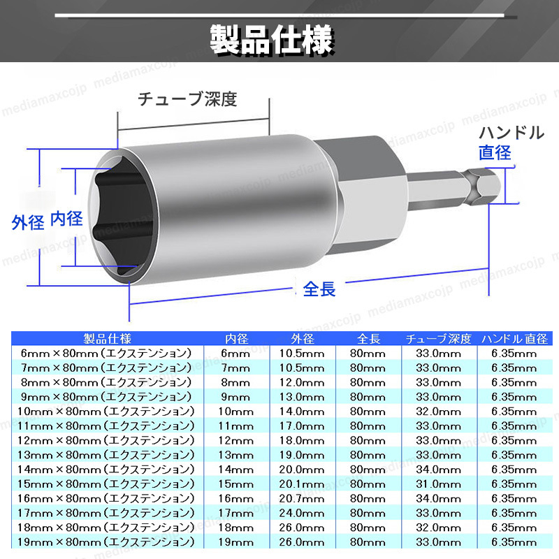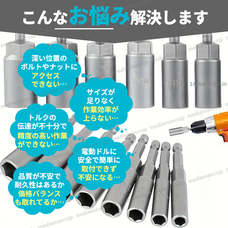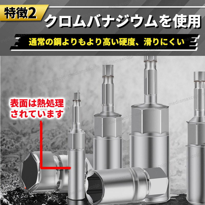 ![]() 車やバイクの整備、DIYに大活躍! 奥まった場所の作業もラクラクこなせる、 ロングタイプのソケット14本セット 届きにくい場所も、もう諦めない。 このソケットセットの最大の特徴は、そのロングタイプであること。 通常のソケットでは届かない、エンジンルームの奥深くや、 狭い隙間にあるボルトやナットにも、しっかりとアクセスできます。 充実の14本セットで、様々なサイズに対応。 6mmから19mmまで、幅広いサイズをずべて網羅した14本セット 様々な種類のボルトやナットに対応可能。これ一つあれば、 多くの作業をこなすことができます。 非磁性で精密機器にも安心。 電子機器や精密機械の分解・組み立て時、磁石の影響を 避けたい場面でも安心の非磁性。 デリケートな作業も、このソケットセットにお任せください。 高硬度クロムバナジウム鋼で、耐久性も抜群。 材質は、高硬度と耐久性に優れたクロムバナジウム鋼を採用。 ハードな使用にも耐え、長くご愛用いただけます。 電動工具との連携で、作業効率も大幅アップ。 ビット交換が簡単な六角軸シャンク6.35mm(1/4インチ)を採用。 電動ドライバーやインパクトドライバーと組み合わせれば、 作業効率が飛躍的に向上します。 スピーディーに作業を進めたい方に最適です。 セット内容詳細: ディープソケット 14本セット サイズ: 6mm, 7mm, 8mm, 9mm, 10mm, 11mm12mm, 13mm, 14mm, 15mm, 16mm17mm, 18mm、19mm 全長: 約80mm 差込口: 六角軸シャンク 6.35mm (1/4インチ) 数量: 14本 このソケットセットがあれば、あなたの作業がよりスムーズに、 そして効率的になること間違いなしです。 ぜひ、あなたの工具箱に加えてみてください。 | ||
