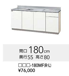 | ◎クリナップ・木キャビ・流し台『新クリンプレティ』特別価格 間口1800mm・即決価格は、写真セット定価76.000円のなんと 48%OFFで43.472円【消費税込】 ◆エコノミーで最適な流し台です。高さ80cm・奥行55cm。 ◆扉の色は、ホワイト・ペールウッドから選択できます。 ◆写真の扉の色は、ペールウッド。シンプルなキッチンに合う、木目調の飽きのこない色です。 ◆ワークトップは、ステンレスです。 ◆引出しの位置を、右側・左側から選択してください。 | |