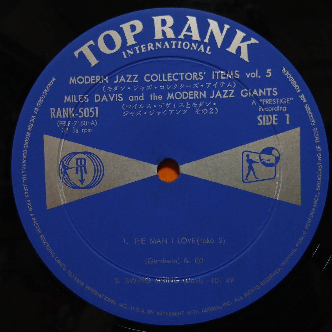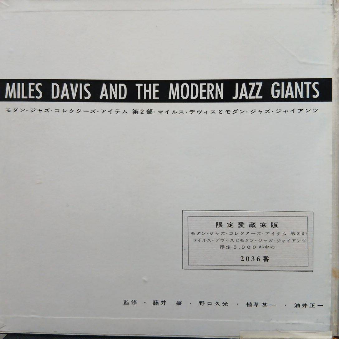 日本TOP RANK (Prestige)、2LP。1960年。めずらしい帯付き。レアなかなり初期の日本のマイルス・デイヴィスの限定ナンバリング入りのレコード。『Miles Davis And The Modern Jazz Giants』や『Collectors' Items』を2枚組にまとめた日本独自のリリース盤。ジョン・コルトレーン、ソニー・ロリンズ、セロニアス・モンク、ミルト・ジャクソン、フィリー・ジョー・ジョーンズ、ポール・チェンバース、コニー・ケイ、パーシー・ヒースらとのセッション。ジャケ、盤ともに年代の割りにはまだまだ状態いい方ですよ。1960年前後の初期のプレスのジャズのLPはめったに市場に出ないのでぜひ。しかも帯付き。