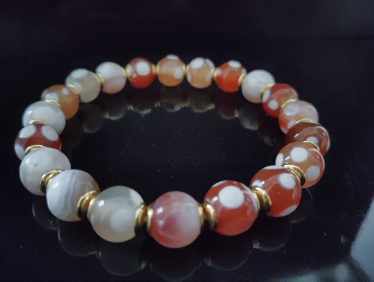 瑪瑙を使ったパワーストーンブレスレットです。アゲート(めのう瑪瑙)には強いヒーリング効果があり、また人間関係を改善する、心身のバランスを整える 、修復する、 精神的な傷を修復するなどの効果があるとされています。 パワーストーンの効果には諸説あります。また、様々な色合いがバランス良く含まれているので、どんなファッションにも合わせやすいです。1本持っているととても便利です。 手首周囲16センチまでの方に| 出价者 | 信用 | 价格 | 时间 |