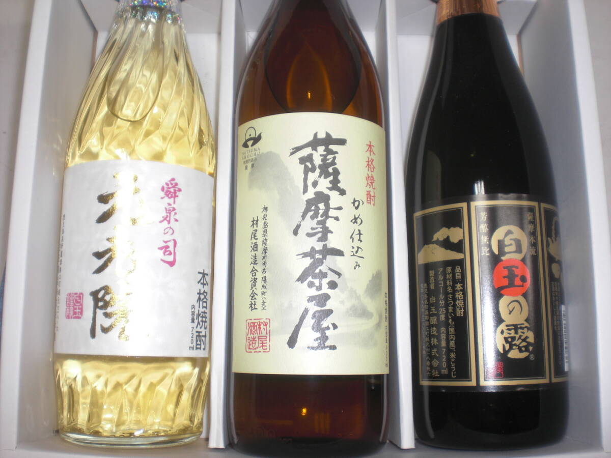 魔王の蔵元白玉醸造の元老院25度720ミリ、白玉の露25度720ミリ、村尾酒造の薩摩茶屋25度900ミリの3銘柄セツト価格です。送料込み価格です。