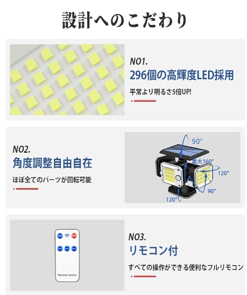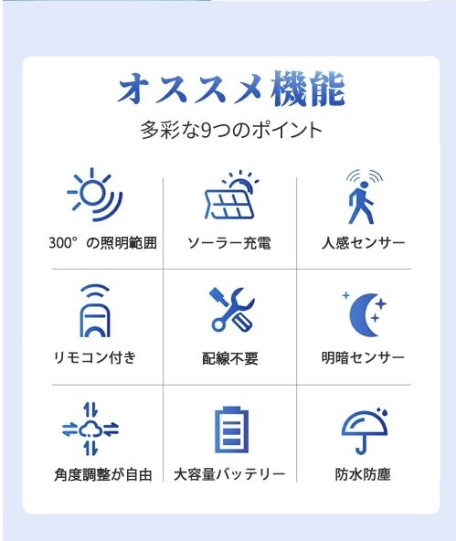 | 製品仕様 | リチウムイオン電池:2400mAh センサー:人感・光感センサー 材質:ポリシリコン+ABS セット内容:ライト本体、リモコン、ネジセット LED:296PCS ソーラースパン寿命:50,000時間 ソーラー充電時間:8時間 防水・防塵規格:IP65 照明モード:1/センサーモード 2.DIMモード 3.常時点灯モード |