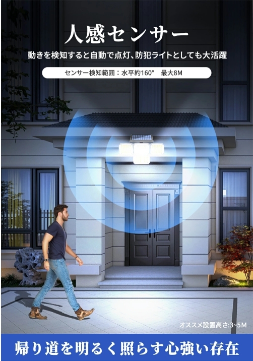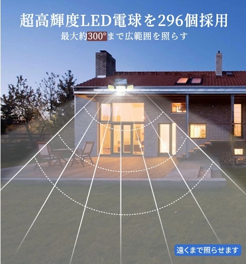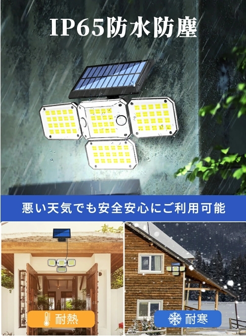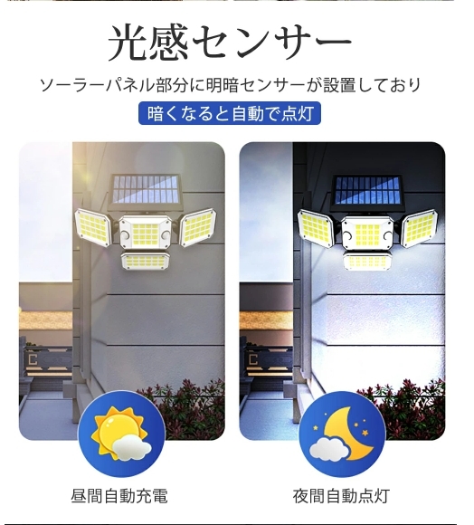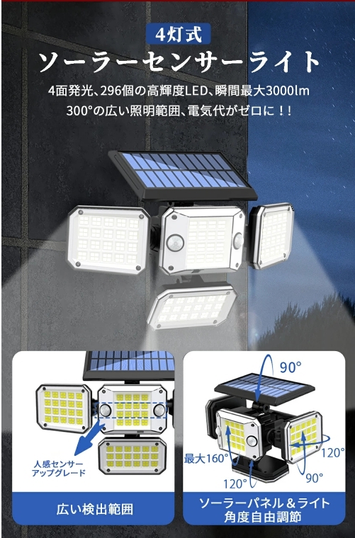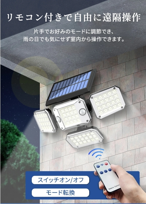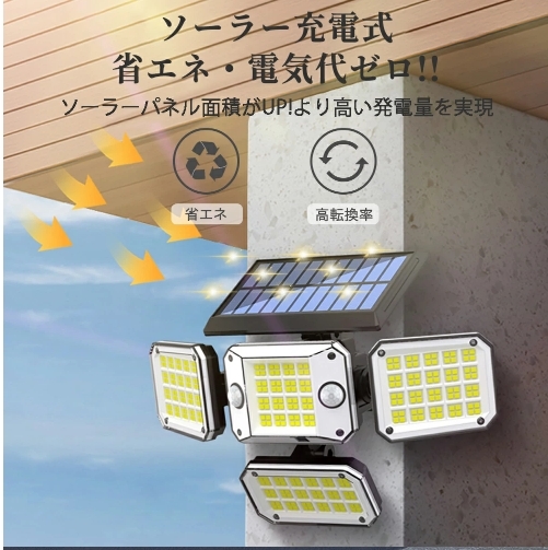 | 商品特徴 | 【最新4灯式・296個の高輝度LED】最新4灯式のセンサーライトで高輝度LEDを296個採用。明るさだけではなく、照明範囲、人感センサーなどの機能も充実しています。光の照射角度を300度まで調節でき、人感センサーは最大160度の範囲で感知可能。ソーラーパネル部分は上下90度に動かすことができ、本体各部位も角度調節が可能です。 【分離式・一体式の選べる2タイプ】便利な一体型と分離型の2タイプが選べます。分離式を使用することで屋内外通用で使用可能。ソーラーパネルとライトを別々の場所に設置でき、車庫など普通の照明ライトが設置しにくい場所を明るくします。 【電気代ゼロ・大容量電池】ソーラーパネル搭載のため、昼間は日光を受けて内蔵された電池に充電し、暗くなると電池でLED点灯します。エネルギー転換率は20%!電気代ゼロ、廃棄ガスを排出しないので環境にも優しいです。フル充電の状態で最低6~8時間点灯できますので、停電対策・地震や台風など万が一の場合でも照明機能を保ち、防犯や緊急時の場合でも役に立ちます! 【光感&人感センサー】3つの点灯モードにより、自動的にライトの点灯・消灯をしてくれます。電源を切るのを忘れるなどの心配もなく、手間も省けます。 【リモコン付き】全ての本体操作が可能なフルリモコンで、遠隔からでもモード切替ができます。 【防水デザイン】 IP65防水性能及び耐熱性と耐久性を持っています。浸水、変形、破裂などの心配がなく、厳しい天候でも耐えられる構造になっています。 |