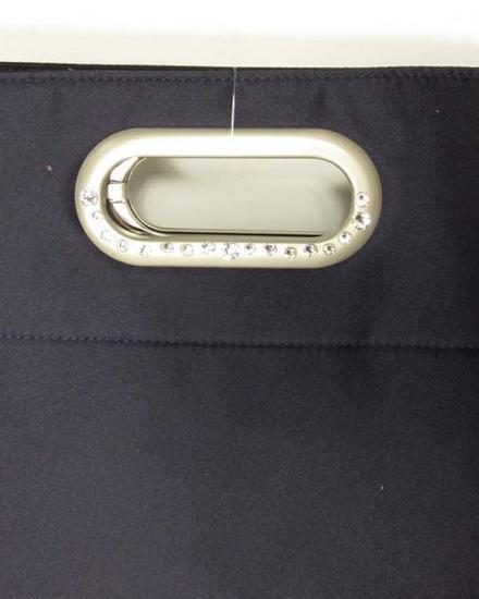 | 2WAYで使えるエレガントなノベルティのバッグ。ラインストーンが輝くマットシルバーのハンドルが上品な光沢の濃紺に映える素敵なデザイン。ブランドロゴ刺繍もさり気ないアピールですね薄い綿入りで少し厚みのあるお作りです。二つに折れば、クラッチバッグとしてもお使い頂けます。 |