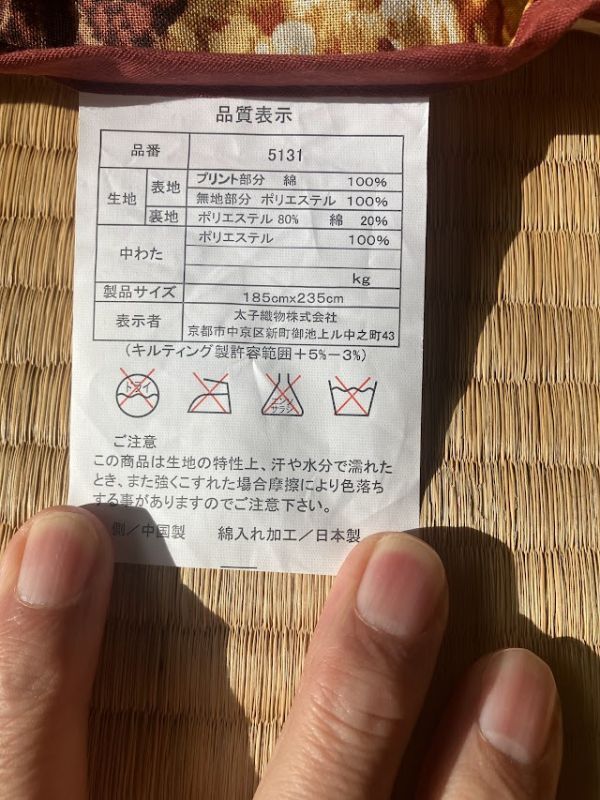 | 商品説明 | ■日本製 ■表地:綿100% ■裏地:ポリエステル80%、綿20% ■中綿:ポリエステル100% ■サイズ:185×235Cm(出来上がりサイズ) ■側サイズ200×250 | ||||||||||